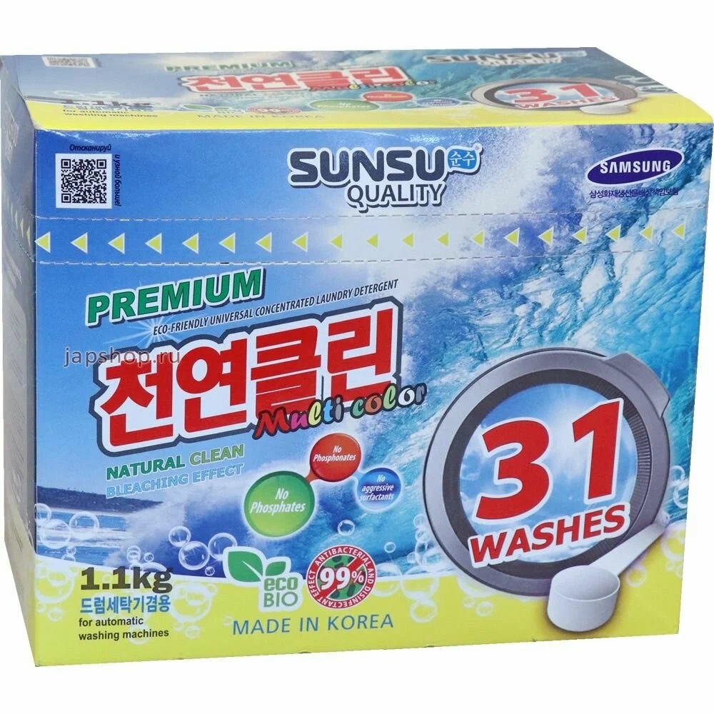 SUNSU-Q Беcфосфатный порошок концентрат для деликатной стирки и белого белья, короб с ложечкой 1,1кг (31 стирка) аналог 5кг