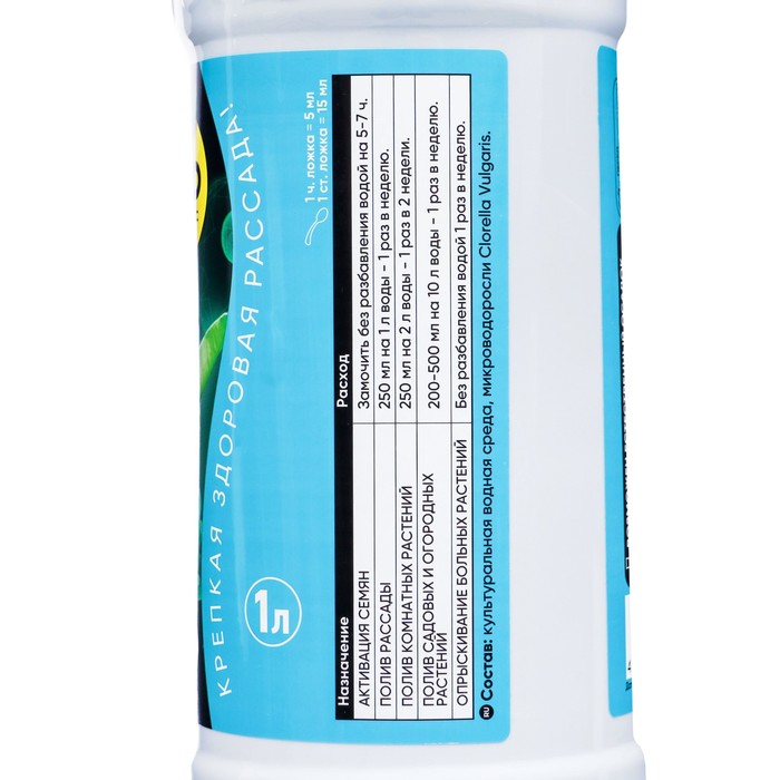 Состав: Более 650 полезных веществ в сбалансированном состоянии. Комплекс фитогормонов (гибберелины, ауксины, цитокинины и др.). Более 40 аминокислот. Все известные витамины (А, В1, В2, В5, В6, В9, В12, С, D, Е, К, РР и др.) Макро- и микроэлементы в биодоступной форме. Природный антибиотик хлореллин.