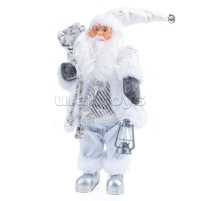 Сувенирный Дедушка Мороз сможет стать замечательным подарком для ваших друзей или же послужит декоративным элементом для украшения интерьера к Новому году и Рождеству. Дедушка Мороз с белой бородой в серебристом костюме с меховой отделкой, на голове колпак с бубенцом. На плече он держит мешок с подарками, а в руке - фонарь. Фигурка несомненно создаст уютную, праздничную атмосферу и подарит много радости не только детям, но и взрослым.