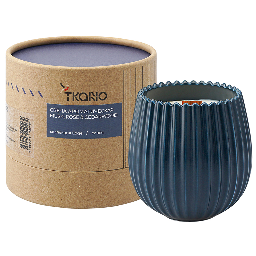 Коллекция: Edge Название товара: Свеча ароматическая с деревянным фитилём Musk, Rose & Cedarwood из коллекции Edge, синий, 60 ч Артикул: TK23-ARO0044 Материал: соевый воск, кокосовый воск, ароматическая композиция, деревянный фитиль Цвет: синий Вес: 538 гр Размеры в упаковке (ШхГхВ): 11,6 х 11,6 х 10,5 см Размеры без упаковки (ШхГхВ): 7,5 х 7,5 х 8 см Свеча ароматическая с деревянным фитилем Musk, Rose & Cedarwood синего цвета из коллекции Edge с дизайном, вдохновленным русскими традициями, отлично подойдет для домашнего декора и создания в интерьере уютной, расслабляющей атмосферы. Фактурные грани и округлая поверхность фарфорового стакана отсылают нас к образу купола – символу духовного подъема и стремления к совершенству. Экологичные материалы, такие как соевый, кокосовый воск и фитиль из натурального дерева делают свечу безопасной для здоровья и окружающей среды. При горении она не выделяет вредных соединений и не коптит. Однако, во избежание перегрева стакана, рекомендуем не зажигать ее более, чем на 4 часа. Аромат свечи подарит чувство спокойствия и умиротворения, став мостиком между внутренним и внешним мирами. Красивое сочетание сливочно-ванильных, древесных и цветочных нот погружает в медитативное состояние, позволяет расслабиться и настроиться на нужный лад. Верхние ноты: сливочно-ванильные, свежий мускус. Средние ноты: бергамот, роза, темные пачули. Базовые ноты: амбра, кедр. Размеры свечи: 8х8х8,5 см. Материал стакана: фарфор. Время горения: 60 ч. Состав: Соевый воск, кокосовый воск, ароматическая композиция, деревянный фитиль. Для создания ароматической композиции использовались отдушки из Англии. Комментарии к товару