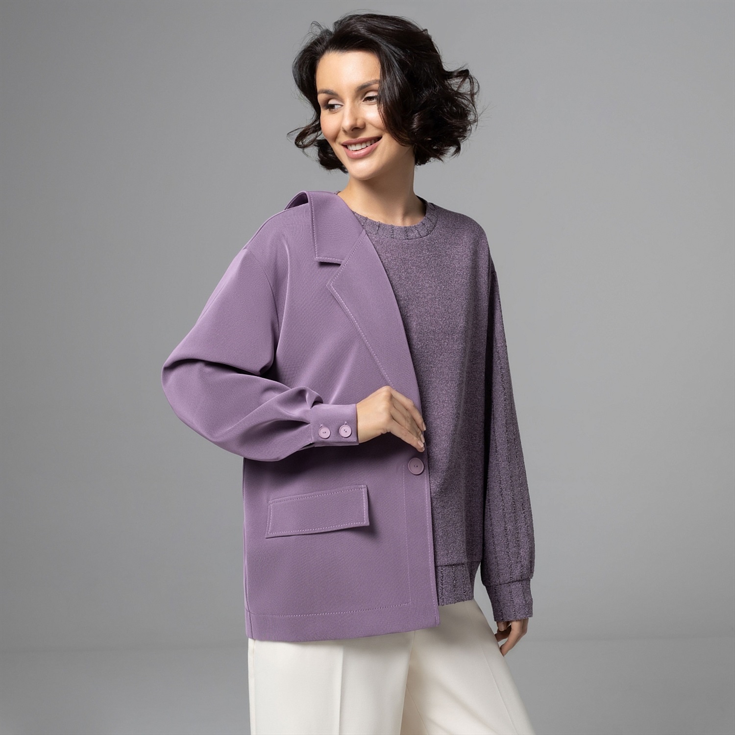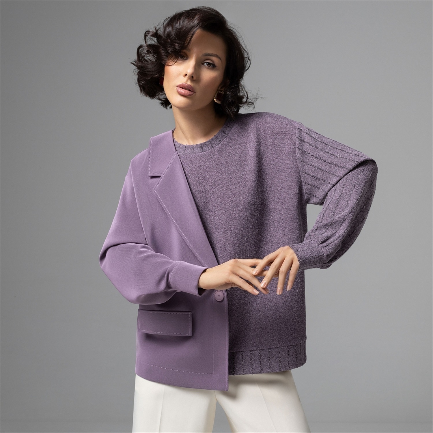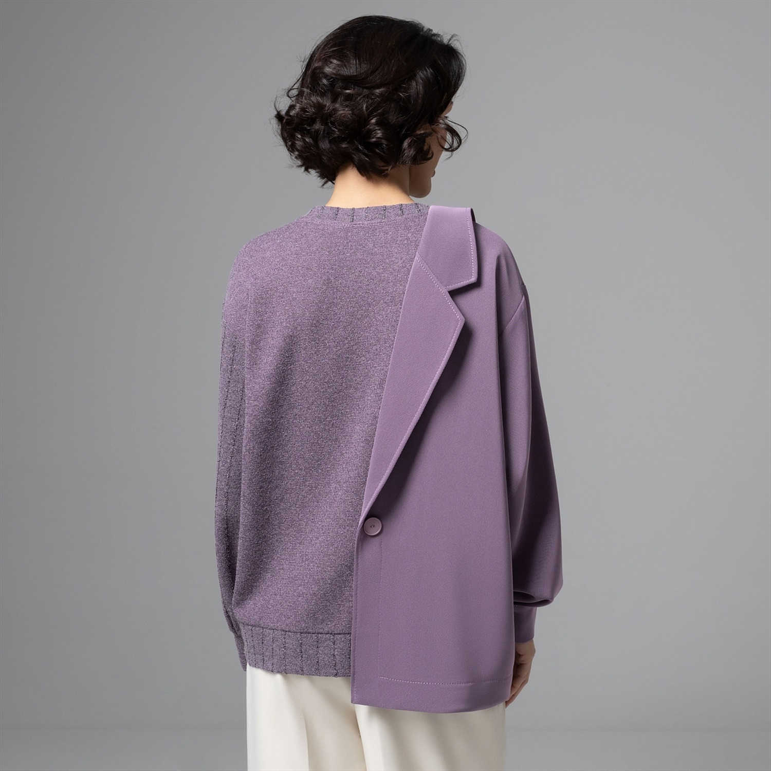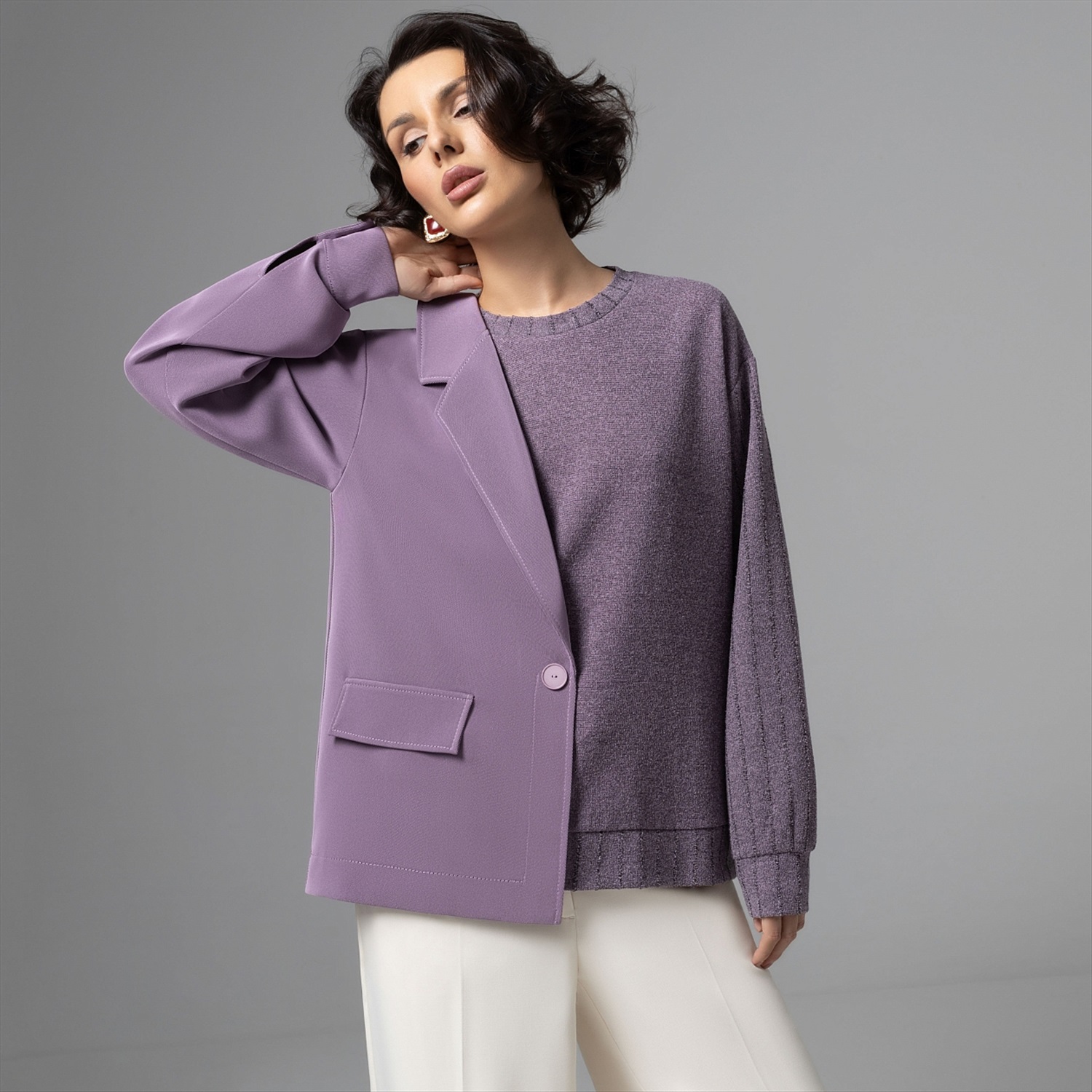 Этот свитшот – вещь для тех, кто между комфортом и авангардом выбирает сразу всё. Половина – мягкий букле‑свитшот, другая – графичный жакет в дымчато‑лавандовом оттенке: будто два любимых образа встретились в одной капсульной вещи. Продвинутое чувство стиля и неочевидный крой сразу выдают в вас человека, который задает настроение, а не подстраивается под дресс‑код. Фактурный трикотаж букле дает объем и тактильный комфорт, хорошо держит форму и почти не мнется. Внутренняя обработка выполнена по стандартам премиум‑капсулы.