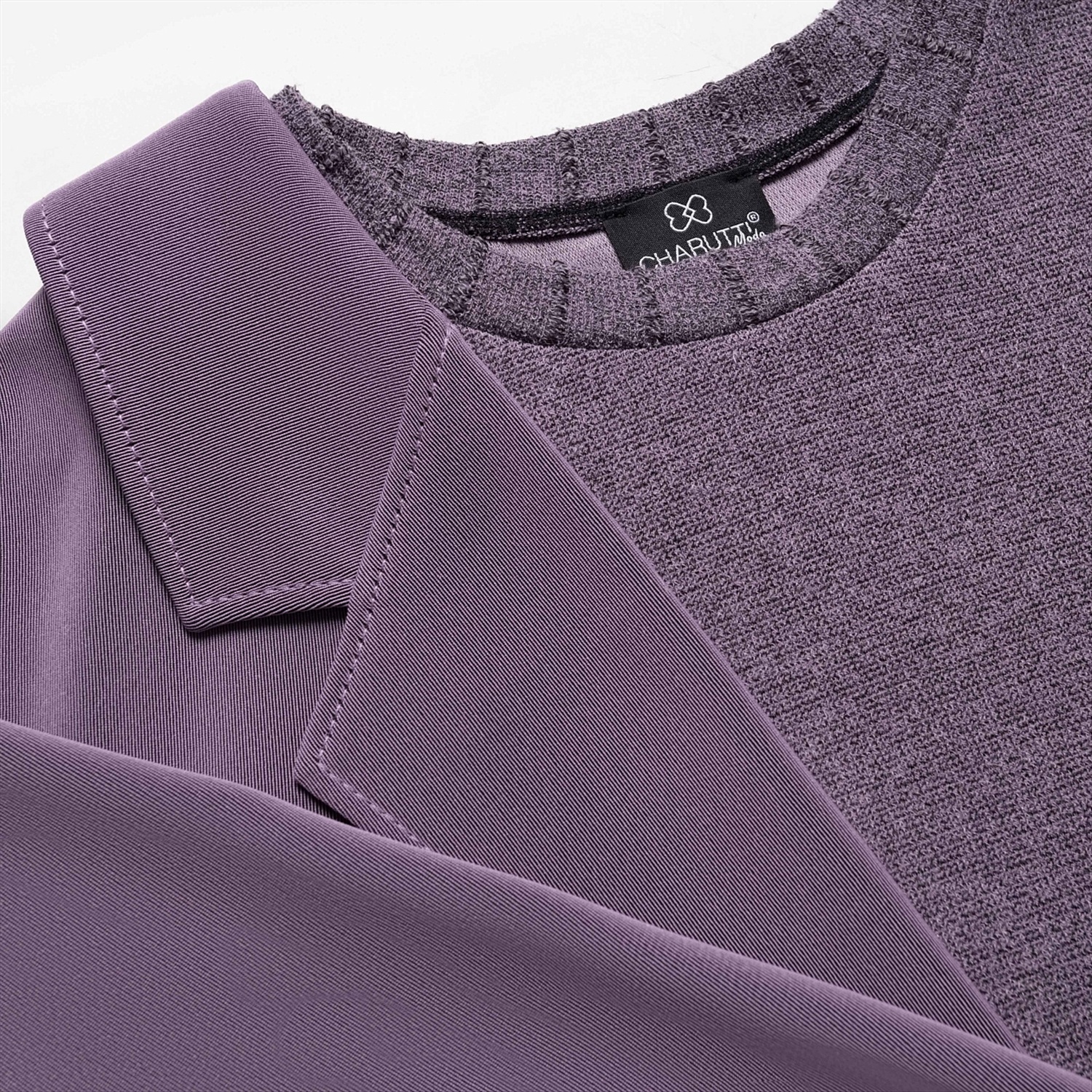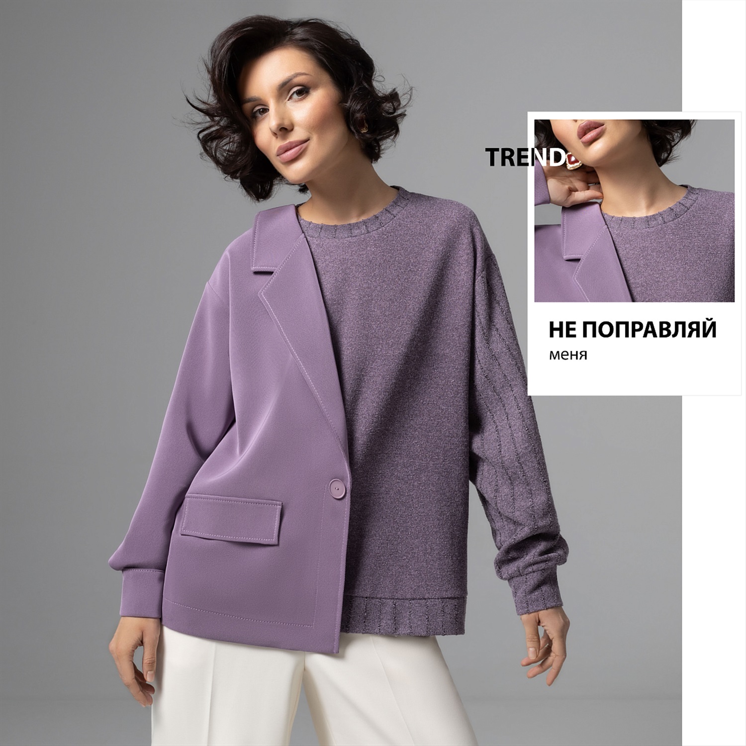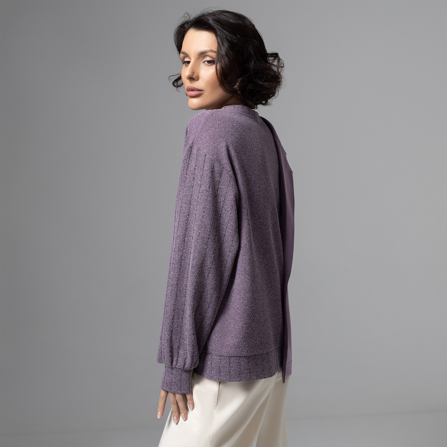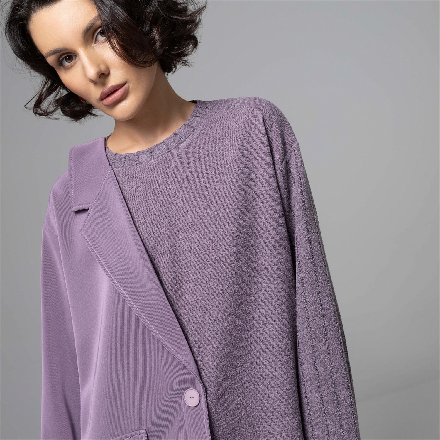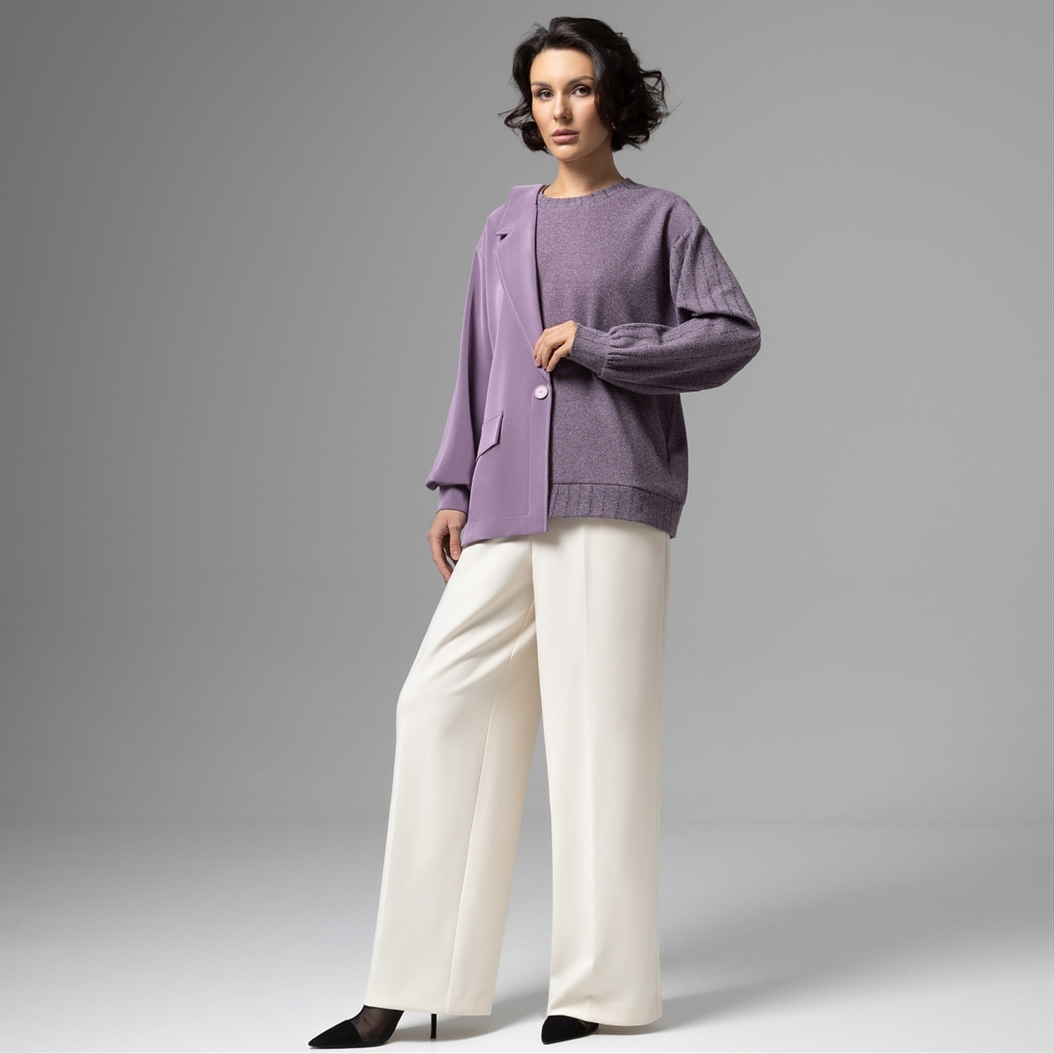 Этот свитшот – вещь для тех, кто между комфортом и авангардом выбирает сразу всё. Половина – мягкий букле‑свитшот, другая – графичный жакет в дымчато‑лавандовом оттенке: будто два любимых образа встретились в одной капсульной вещи. Продвинутое чувство стиля и неочевидный крой сразу выдают в вас человека, который задает настроение, а не подстраивается под дресс‑код. Фактурный трикотаж букле дает объем и тактильный комфорт, хорошо держит форму и почти не мнется. Внутренняя обработка выполнена по стандартам премиум‑капсулы.