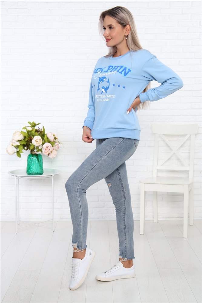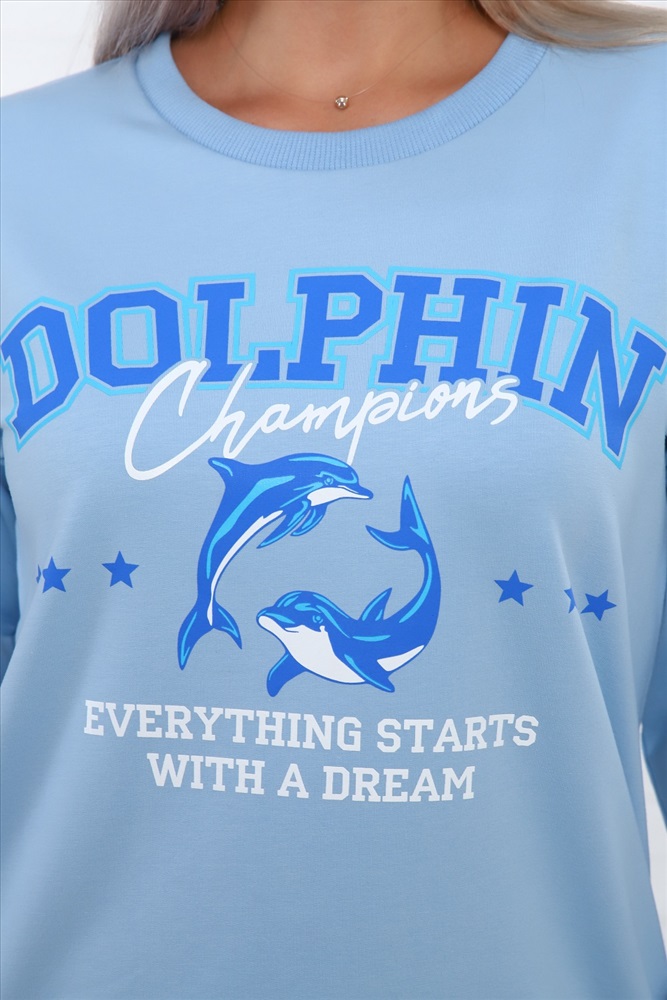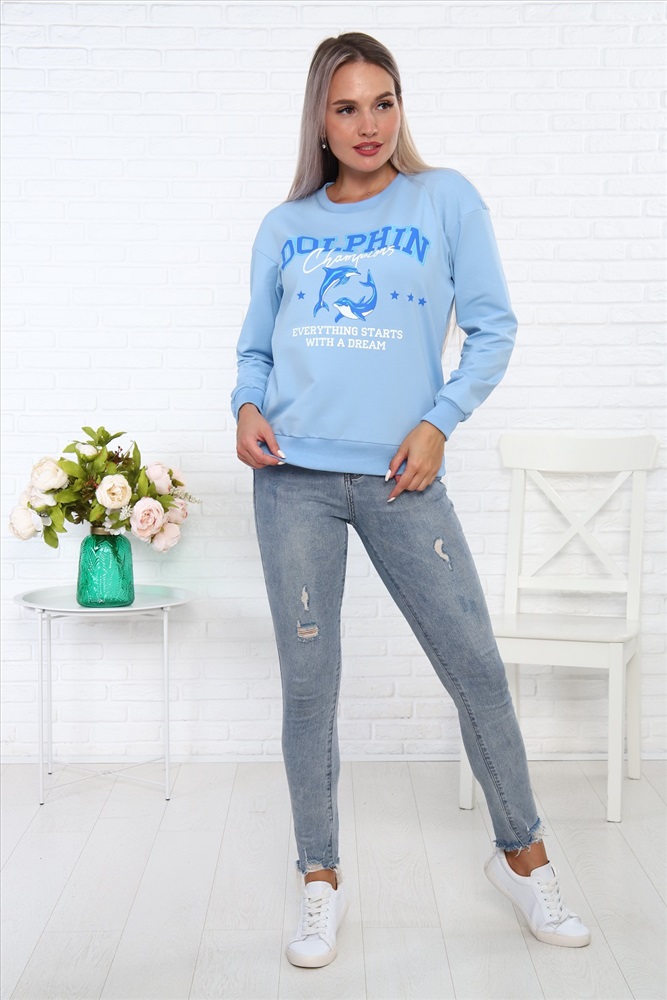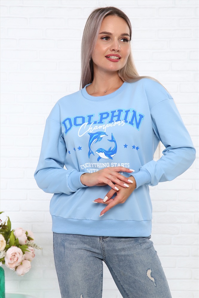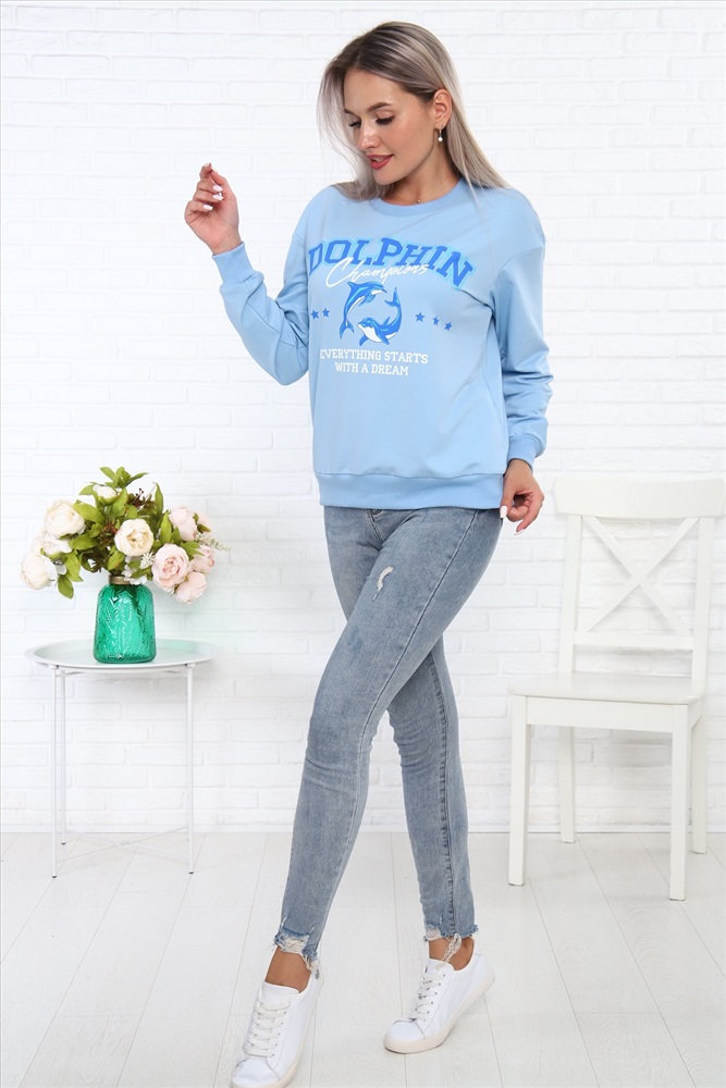 Свитшот Дельфин из футера, со стильным принтом на груди, низ на поясе - кашкорсе. Рукава длинные, с манжетом - кашкорсе.