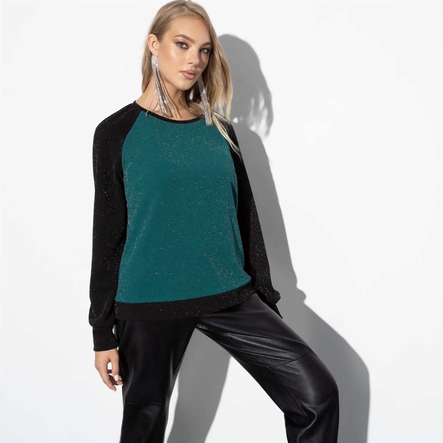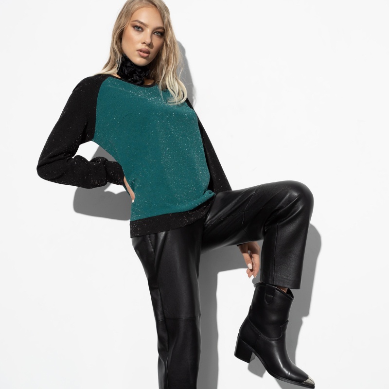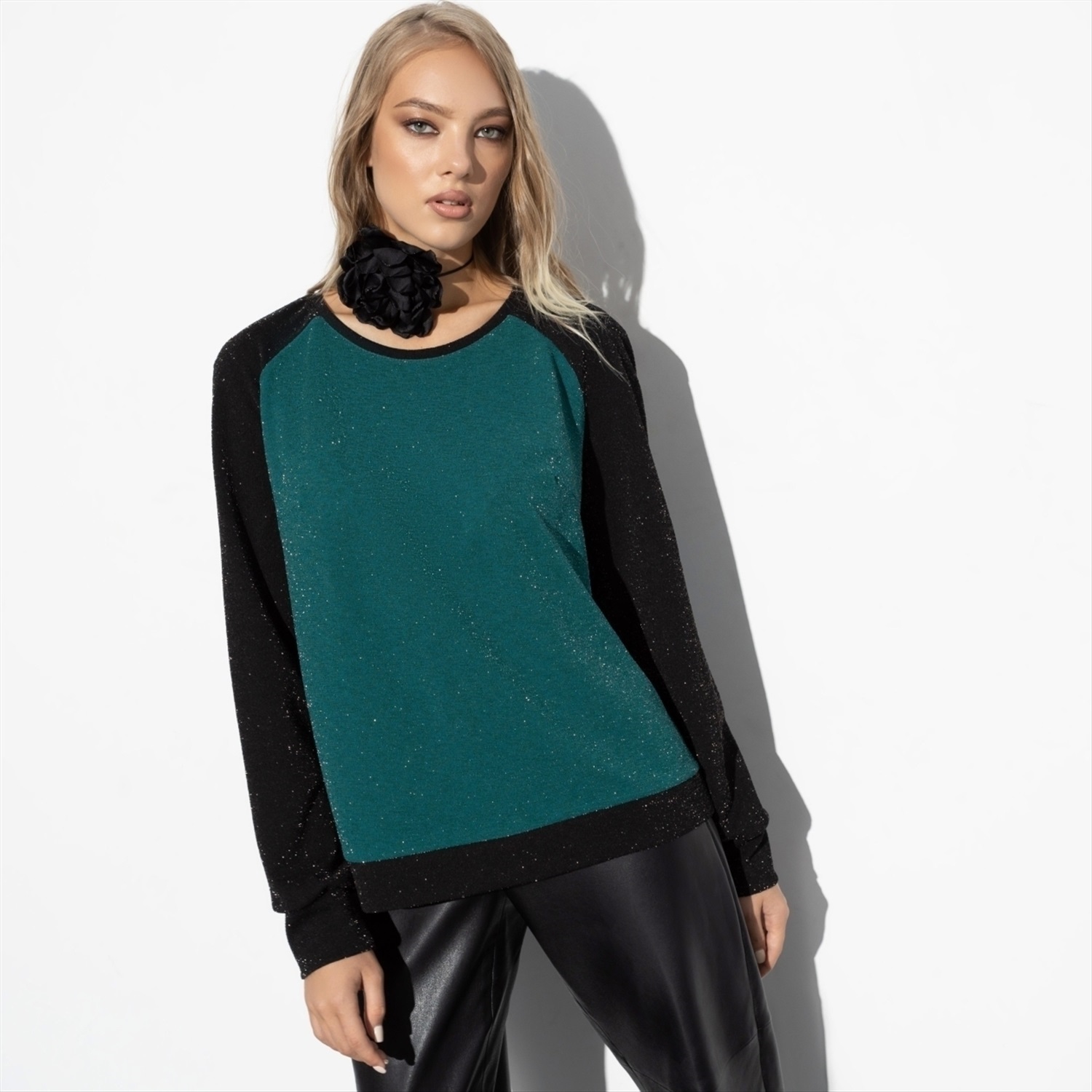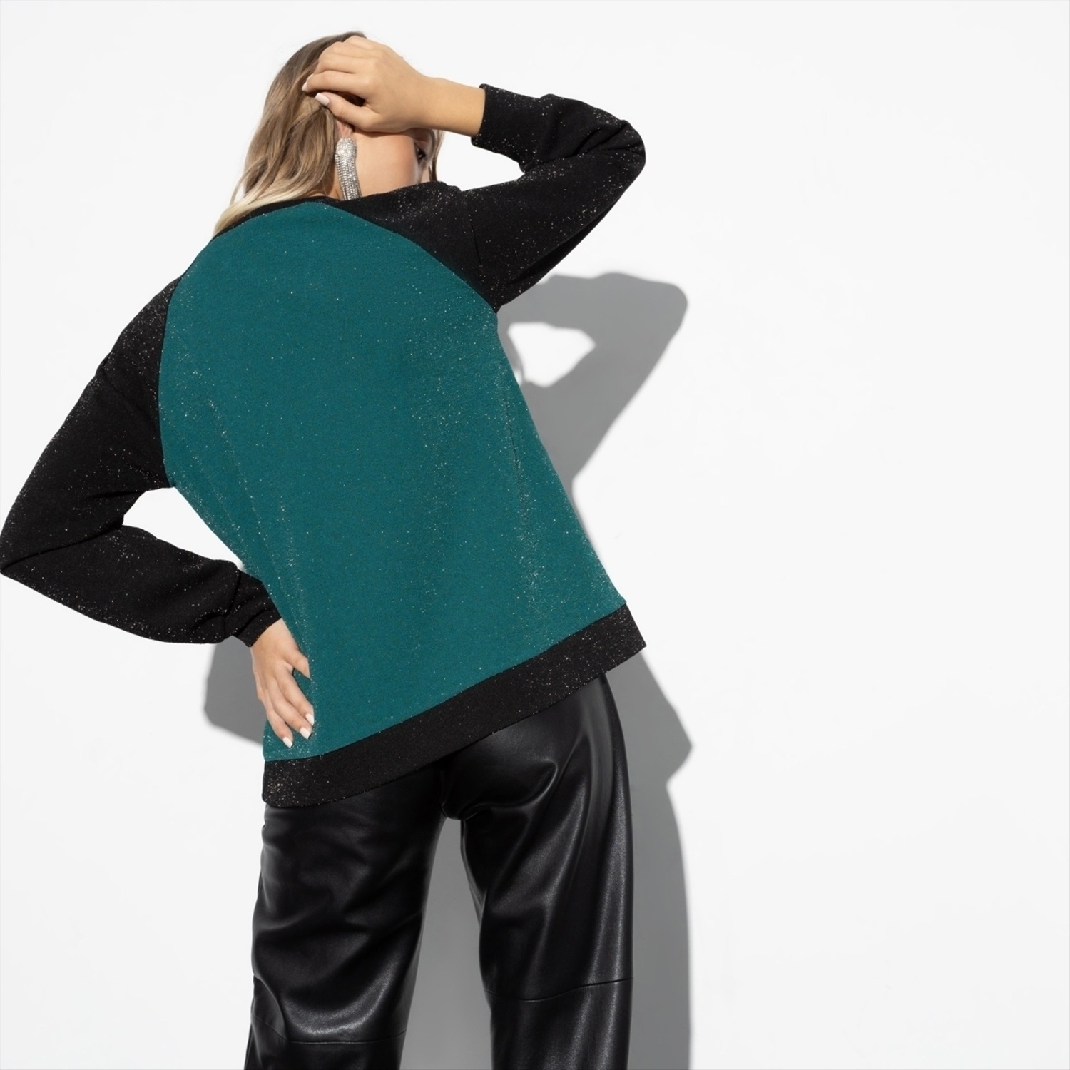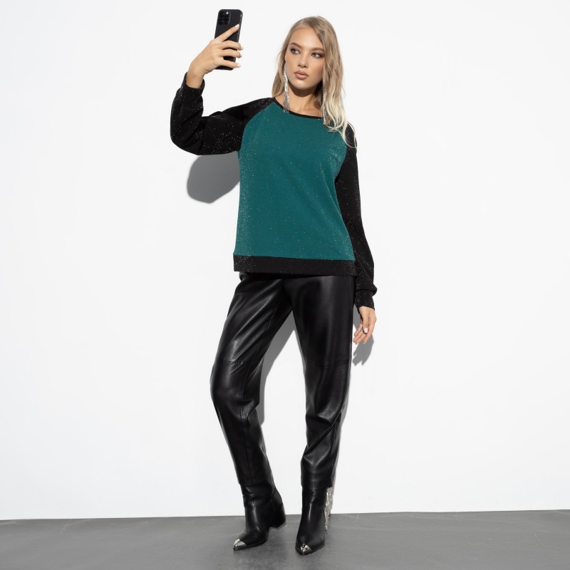 ТН ВЭД: 6110309900; Состав: «Трикотаж с люрексом» (93% п/э, 3% металлическая нить, 4% спандекс); Плотность ткани: Средняя; Тип ткани: Трикотаж с люрексом; Вид застежки: Нет; Дополнительный цвет ткани: Черный; Карманы: Нет; Основной цвет ткани: Бирюзовый; Отрезная талия: Нет; Подклад: Нет; Резинка по талии: Нет; Рисунок/раппорт: Нет, все изделия идентичны; Сезон: Круглогодичный