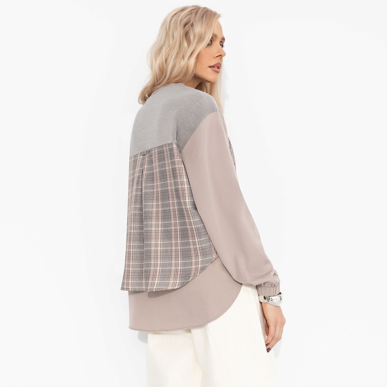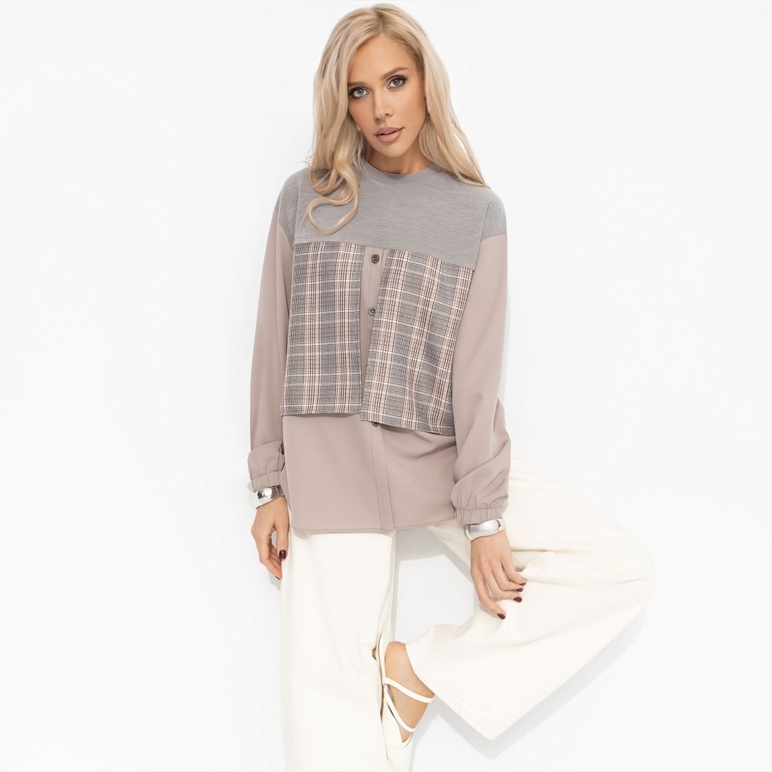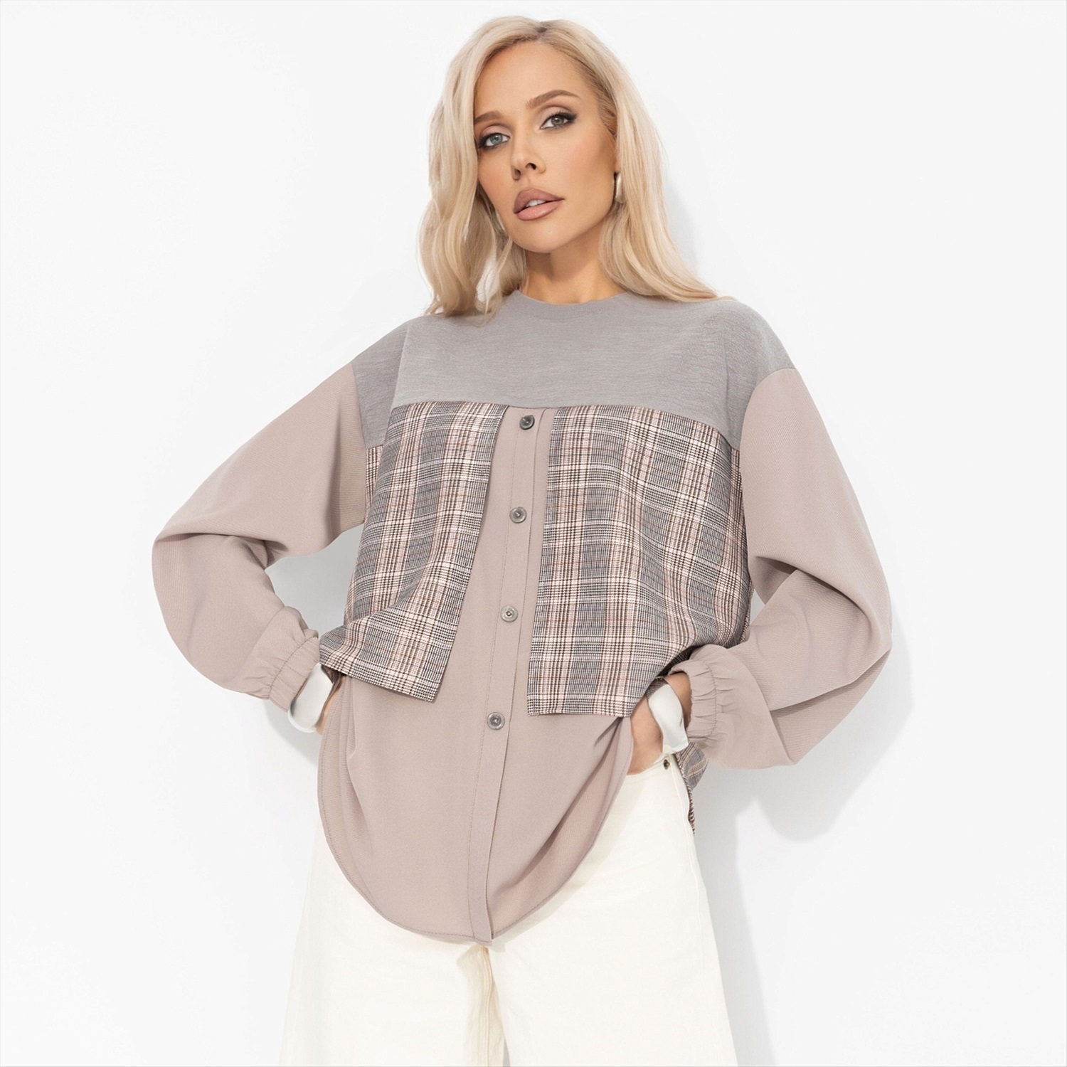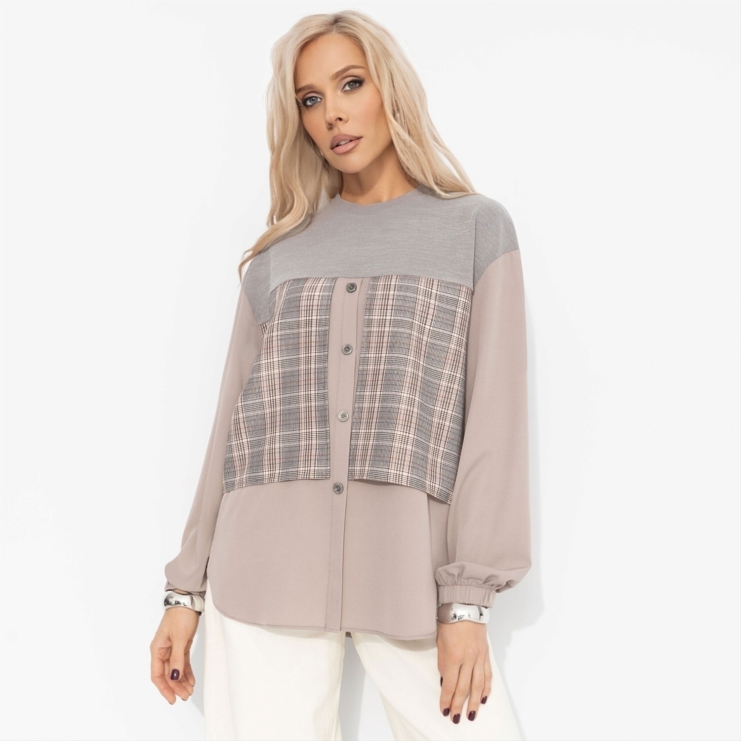 ТН ВЭД: 6110909000; Состав: Блузочная ткань «твил», трикотаж «рибана», тиаф клетка (65% полиэстер, 30% вискоза, 5% спандекс); Плотность ткани: Средняя; Тип ткани: Трикотаж, текстиль; Вид застежки: Нет; Декоративные элементы: Пуговицы; Дополнительный цвет ткани: Разноцветный; Карманы: Нет; Основной цвет ткани: Бежевый; Отрезная талия: Нет; Подклад: Нет; Резинка по талии: Нет; Рисунок/раппорт: Нет, все изделия идентичны; Сезон: Круглогодичный; Силуэт: Свободный; Стиль: Повседневный