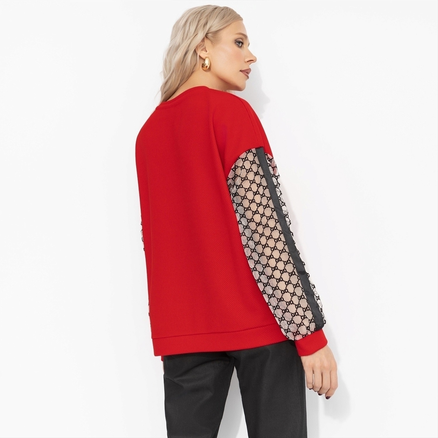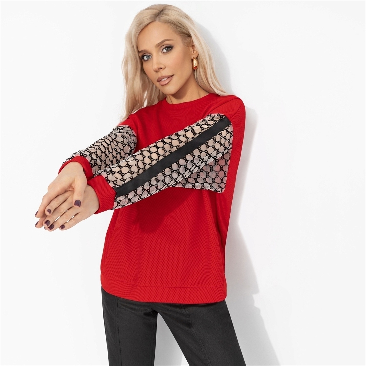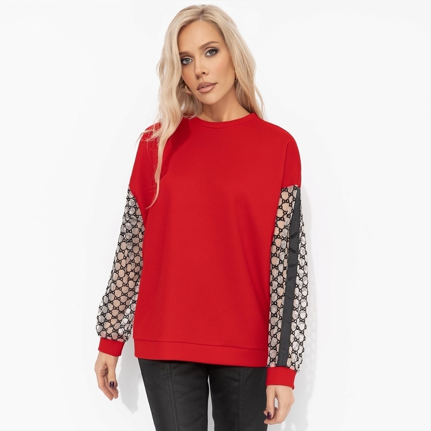 ТН ВЭД: 6110309900; Состав: Фукро однотонный, сетка флак (85% п/э, 15%эластан); Плотность ткани: Средняя; Тип ткани: Трикотаж; Декоративные элементы: Контрастная отделка; Дополнительный цвет ткани: Черный; Карманы: Нет; Основной цвет ткани: Красный; Отрезная талия: Нет; Подклад: Нет; Резинка по талии: Нет; Рисунок/раппорт: Каждое изделие уникально из-за расположения рисунка на ткани; Сезон: Круглогодичный; Силуэт: Свободный; Стиль: Повседневный