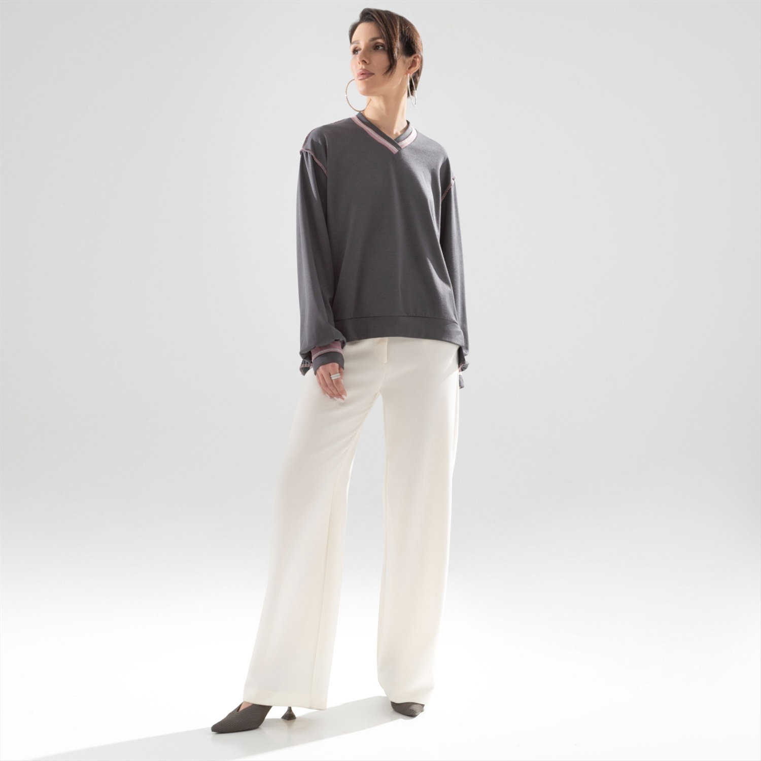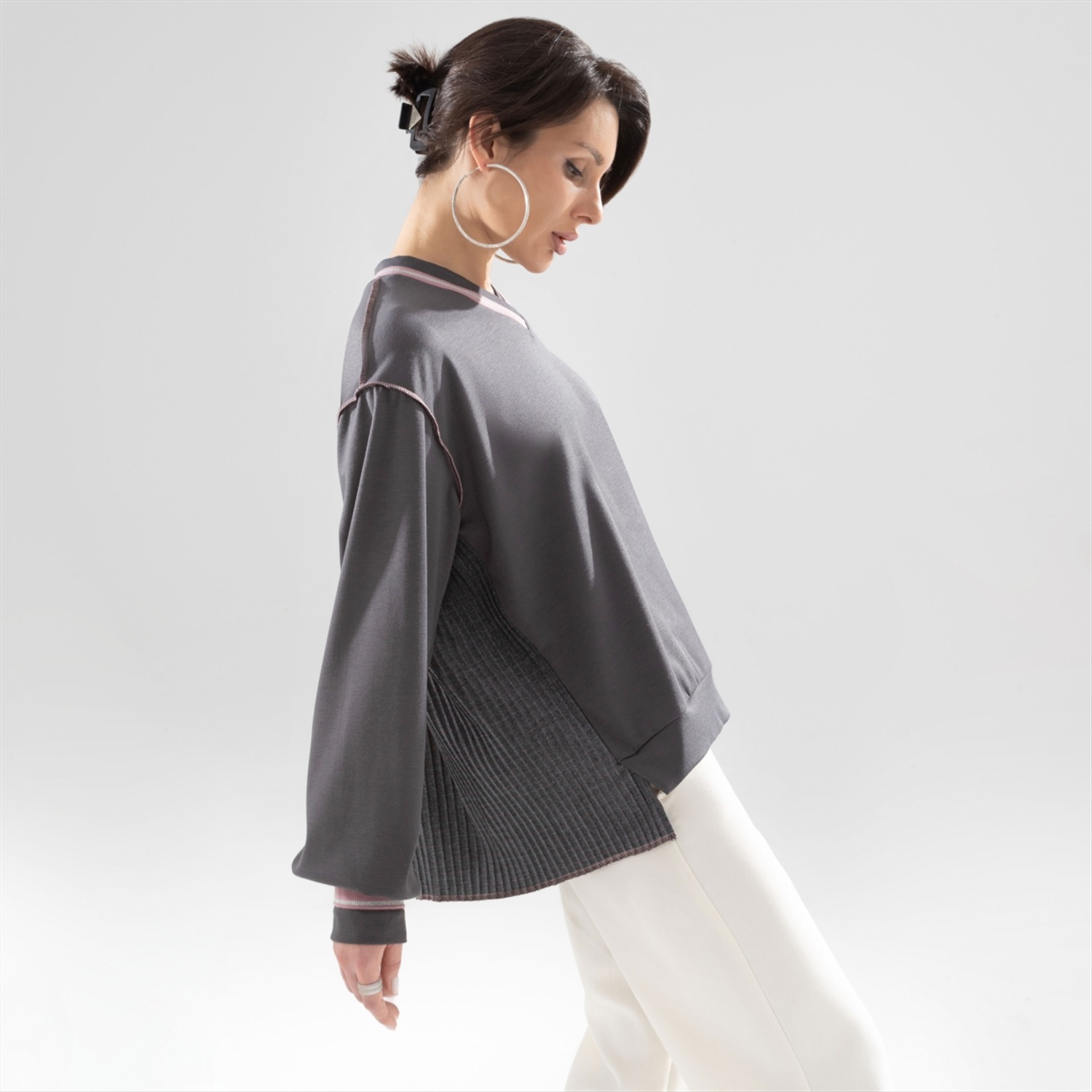 ТН ВЭД: 6106909000; Состав: Трикотаж «поливискоза», плиссе (65% полиэстер, 30% вискоза, 5% спандекс); Плотность ткани: Плотная; Тип ткани: Текстиль, трикотаж; Вид застежки: Нет; Декоративные элементы: Другое; Карманы: Нет; Основной цвет ткани: Серый; Отрезная талия: Нет; Подклад: Нет; Резинка по талии: Нет; Рисунок/раппорт: Нет, все изделия идентичны; Сезон: Зима; Силуэт: Свободный Быть, а не казаться в свитшоте CHARUTTI. Дизайнерский крой свитшота, помноженный на безупречный пошив и ткани из линейки премиальных материалов. Элегантный casual-образ для современной стильной женщины. Свитшот свободного кроя с акцентными швами наружу. Логотип бренда вшит на внешней стороне изделия на спинке. Комбинация нескольких видов материала. Линия плеча чуть спущена. Рукав удлинен.