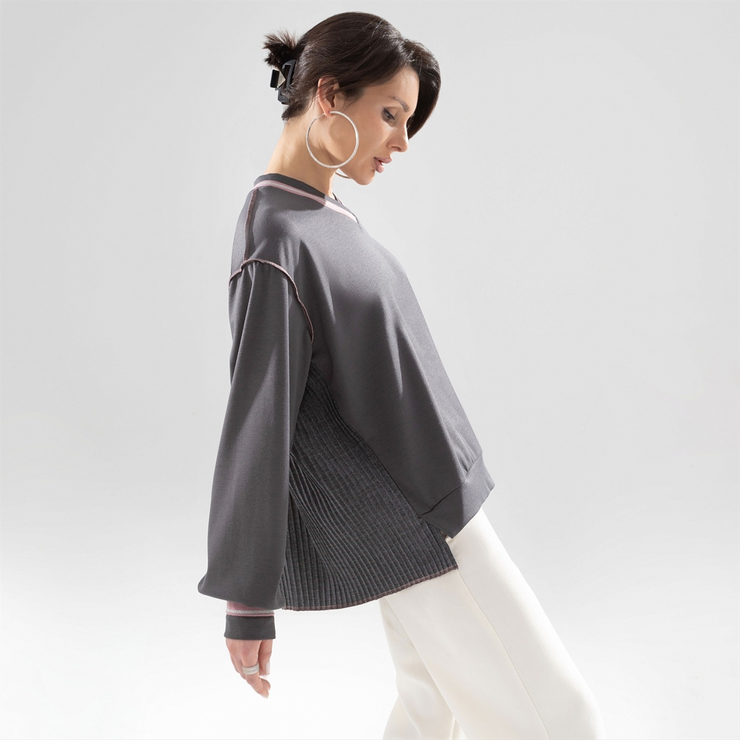 ТН ВЭД: 6106909000; Состав: Трикотаж «поливискоза», плиссе (65% полиэстер, 30% вискоза, 5% спандекс); Плотность ткани: Плотная; Тип ткани: Текстиль, трикотаж; Вид застежки: Нет; Декоративные элементы: Другое; Карманы: Нет; Основной цвет ткани: Серый; Отрезная талия: Нет; Подклад: Нет; Резинка по талии: Нет; Рисунок/раппорт: Нет, все изделия идентичны; Сезон: Зима; Силуэт: Свободный