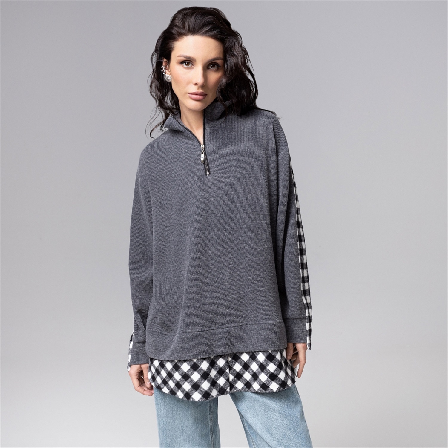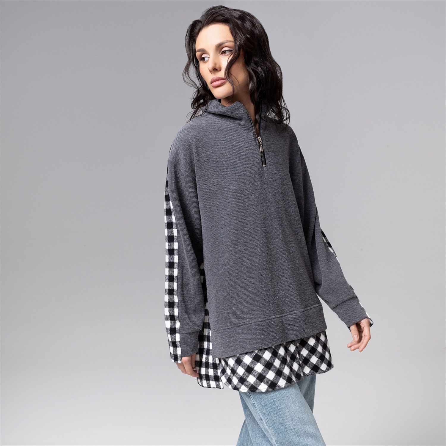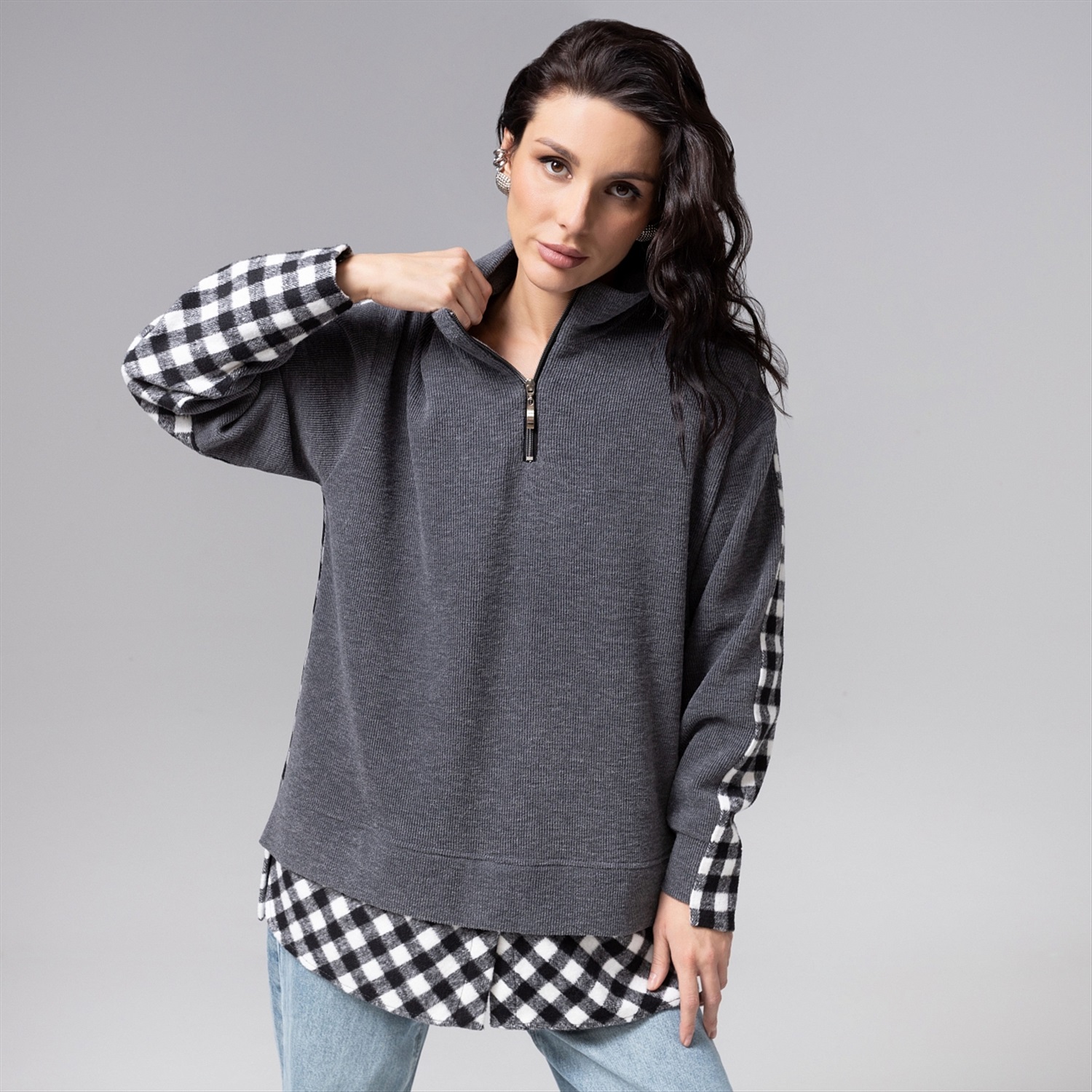ТН ВЭД: 6110309900; Состав: Трикотаж «дженифер», фланель «жаккард», (65% п/э, 30% вискоза, 5% спандекс); Плотность ткани: Плотная; Тип ткани: Текстиль, трикотаж; Вид застежки: Молния; Декоративные элементы: Другое; Дополнительный цвет ткани: Черный; Карманы: Нет; Основной цвет ткани: Серый; Отрезная талия: Нет; Подклад: Нет; Резинка по талии: Нет; Рисунок/раппорт: Нет, все изделия идентичны; Сезон: Зима; Силуэт: Свободный; Стиль: Повседневный