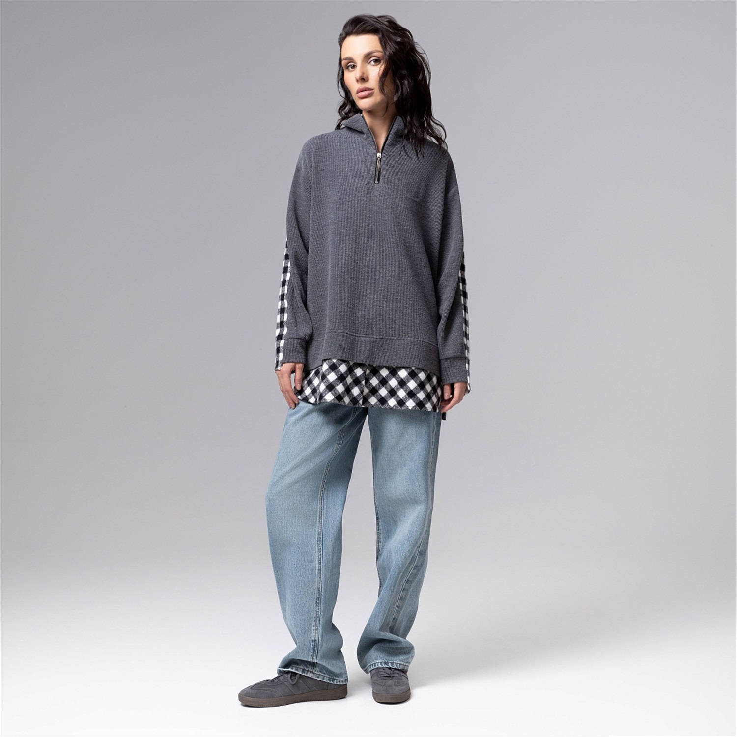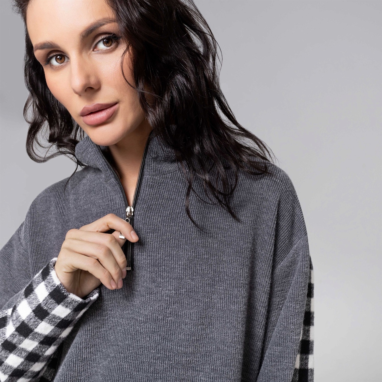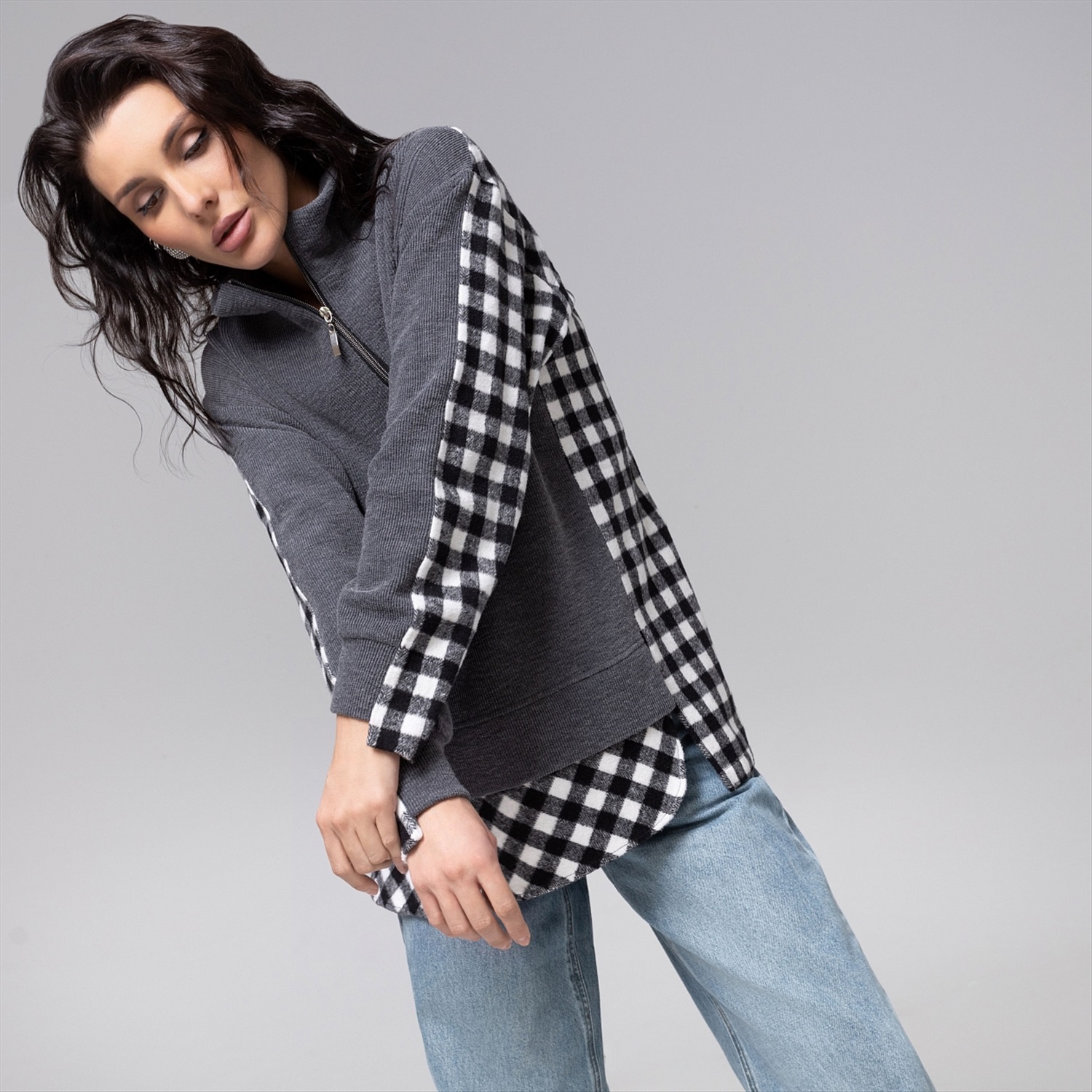 ТН ВЭД: 6110309900; Состав: Трикотаж «дженифер», фланель «жаккард», (65% п/э, 30% вискоза, 5% спандекс); Плотность ткани: Плотная; Тип ткани: Текстиль, трикотаж; Вид застежки: Молния; Декоративные элементы: Другое; Дополнительный цвет ткани: Черный; Карманы: Нет; Основной цвет ткани: Серый; Отрезная талия: Нет; Подклад: Нет; Резинка по талии: Нет; Рисунок/раппорт: Нет, все изделия идентичны; Сезон: Зима; Силуэт: Свободный; Стиль: Повседневный