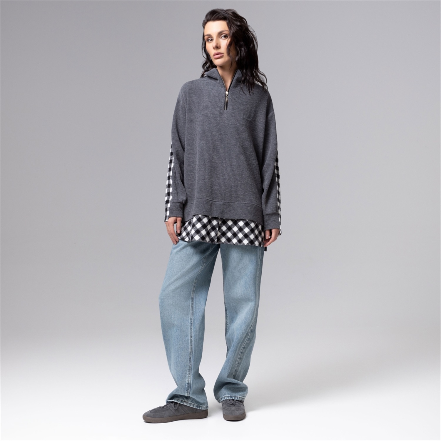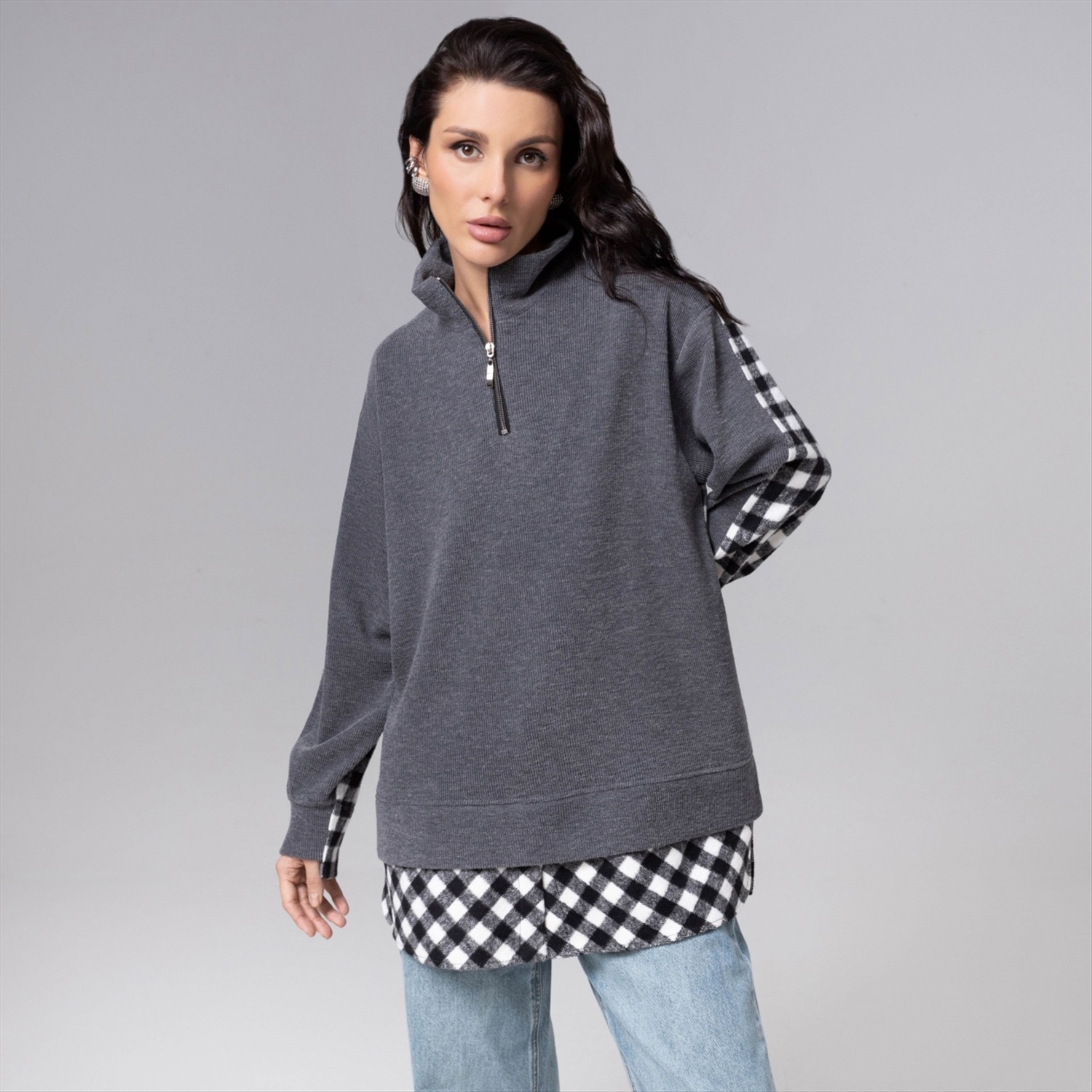ТН ВЭД: 6110309900; Состав: Трикотаж «дженифер», фланель «жаккард», (65% п/э, 30% вискоза, 5% спандекс); Плотность ткани: Плотная; Тип ткани: Текстиль, трикотаж; Вид застежки: Молния; Декоративные элементы: Другое; Дополнительный цвет ткани: Черный; Карманы: Нет; Основной цвет ткани: Серый; Отрезная талия: Нет; Подклад: Нет; Резинка по талии: Нет; Рисунок/раппорт: Нет, все изделия идентичны; Сезон: Зима; Силуэт: Свободный; Стиль: Повседневный Параметры модели на фото: Грудь: 84 см Талия: 61 см Бёдра: 91 см Рост: 175 см. Длина изделия: * 46 размер - 77 см * 48 размер - 78 см * 50 размер - 79 см * 52 размер - 80 см * 54 размер - 81 см * 56 размер - 82 см Длина рукава: * 46 размер - 53 см * 48 размер - 53 см * 50 размер - 54 см * 52 размер - 54 см * 54 размер - 55 см * 56 размер - 55 см Обхват груди: * 46 размер - 120 см * 48 размер - 122 см * 50 размер - 124 см * 52 размер - 126 см * 54 размер - 128 см * 56 размер - 130 см Обхват талии: Обхват бёдер: Вес товара, кг: * 46 размер - 0.51 * 48 размер - 0.52 * 50 размер - 0.52 * 52 размер - 0.54 * 54 размер - 0.54 * 56 размер - 0.55 Габариты товара (ДхШхВ), см.: * 46 размер - 32 х 32 х 5 * 48 размер - 32 х 32 х 5 * 50 размер - 32 х 32 х 5 * 52 размер - 32 х 32 х 5 * 54 размер - 32 х 32 х 5 * 56 размер - 32 х 32 х 5 Название говорит само за себя: «Путешествие начинается». Этот свитшот создан для движения вперёд. Словно утренний город после дождя – он переливается нюансами и фактурами. Он рассказывает историю о движении, начале пути и смелой мечте. Свитшот с имитацией многослойности. Продуманный крой изделия и мякгий трикотаж обеспечивают идеальную посадку на любом типе фигуры. Свитшот удлиненный.