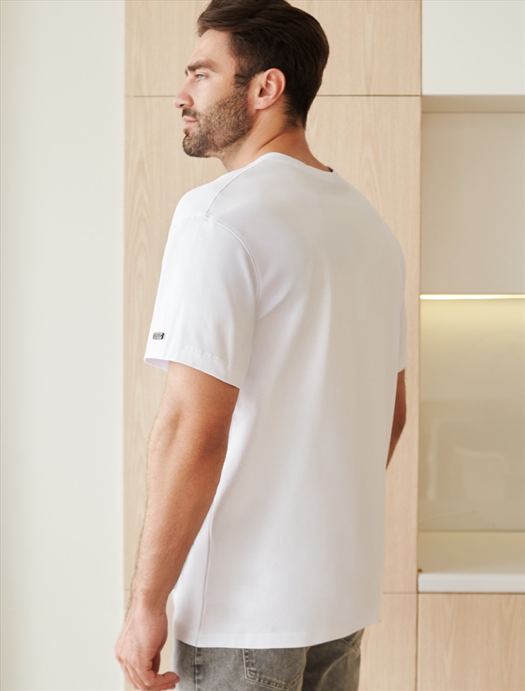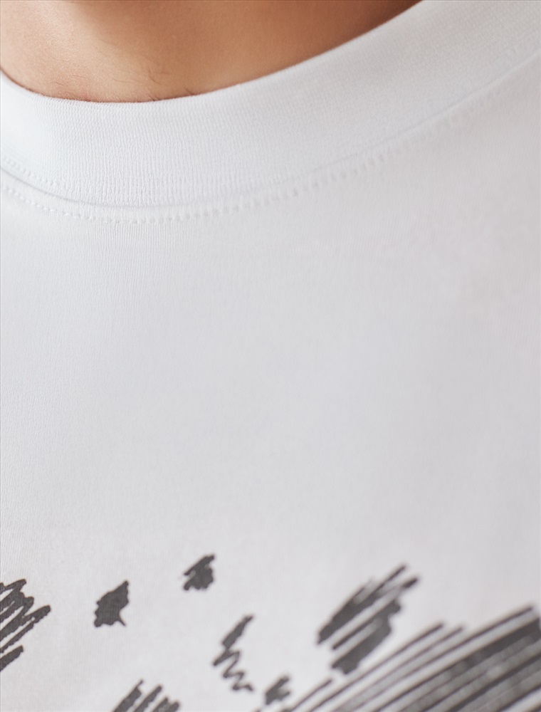 Футболка свободного кроя выполнена из премиального хлопка. Авторский принт нанесен красками с устойчивым покрытием. Благодаря эластану, носить изделие очень комфортно, и оно сохранит свой безупречный вид в течение долгого времени. На рукаве нашивка из эко-кожи с логотипом бренда.