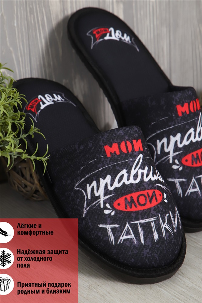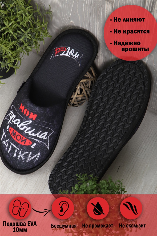 Состав: 100% полиэстер Модель: Тапки Мои правила Тип товара: тапки Материал: сетка | сетка Бренд: Emotion day Назначение: для дома Особенности: открытая пятка | закрытый носок Рисунок: надпись Сезонность: лето | осень | весна | зима Стиль: домашний Мягкие домашние тапочки с закрытым носом и открытой пяткой это идеальный аксессуар для создания уютной атмосферы в вашем доме! Верх и стелька изготовлены из теплых и приятных на ощупь материалов. Подошва изготовленная из высококачественного ПВХ, который еще называют EVA. Обеспечивает отличное сцепление с полом и защиту от скольжения. Это уникальный материал и при всей своей комфортабельности, долго способен выдерживать большие нагрузки Удобные и стильные, эти тапочки с рисунком станут незаменимым аксессуаром вашего домашнего гардероба как зимой, так и в летние дни! Все наши тапки прошиваются для большей износостойкости армированной нитью, а сублимационная печать позволяет наносить краску на волокна ткани, из-за чего цвета получаются насыщенными и сохраняют яркость даже после нескольких стирок. Дизайнерские принты придадут уникальности и поднимут настроение вам и вашим гостям! Кликните на название бренда в карточке товара, чтобы просмотреть весь ассортимент Emotion Day Таблица размеров и веса