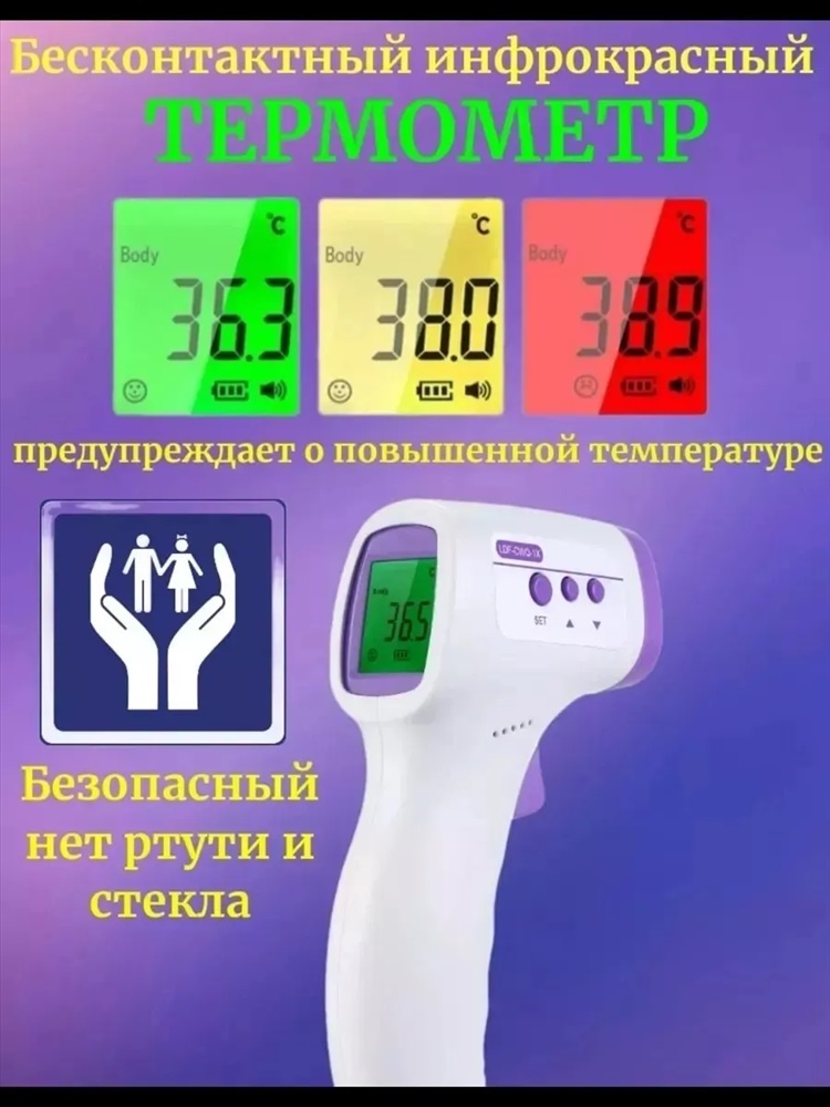 Модель: Термометр бесконтактный 60745 Тип товара: термометр Бренд: Без бренда Бесконтактный медицинский термометр - это цифровое устройство для измерения температуры тела у взрослых и детей. Он обладает инфракрасным излучением, которое помогает понять вашу температуру тела. Главные преимущества электронного термометра: - измерение температуры всего за 1-ну секунду; - безртутный и не стеклянный, поэтому он долговечный и безопасный для окружающих; - его не нужно протирать после каждого использования; - дисплей; - цвет экрана меняется в зависимости от высоты температуры (зеленый - все в порядке; желтый - слегка повышена, красный - сильно высокая); - с сертификатом; - удобно узнать температуру, пока малыш спит или играет. Устройство оснащено встроенной памятью, в которой сохраняются результаты последних 32-х замеров, ртутный такого точно не сделает. После использования он отключится сам через 15-ть секунд. Бесконтактный детский градусник для тела облегчит процесс и быстро выдаст результат. Таблица размеров и веса