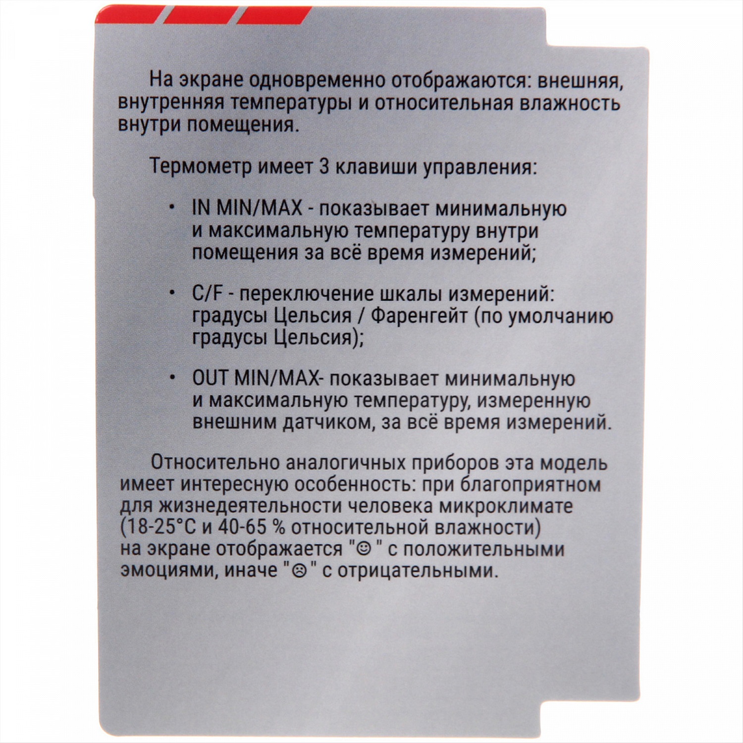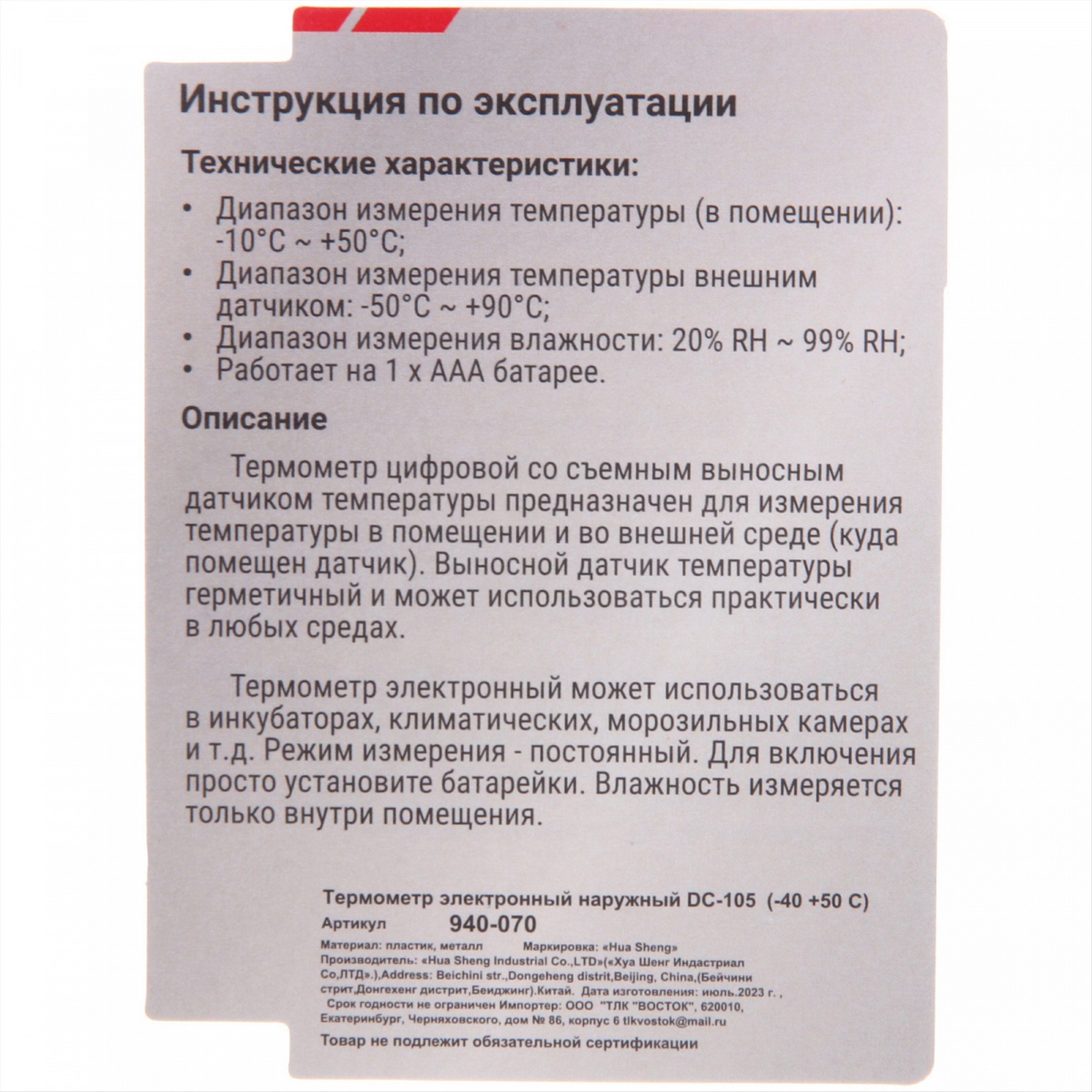 Термометр электронный наружный DC-105 (-40 +50 С) позволяет точно измерять относительную влажность воздуха и температуру. Длина выносного датчика 1 м.