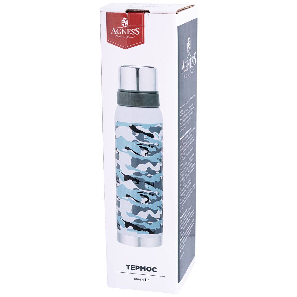 ТЕРМОС AGNESS С УЗКИМ ГОРЛОМ И 2-МЯ КРЫШКАМИ-ЧАШКАМИ, 1000МЛ, КОЛБА НЖС (КОР=12ШТ.)