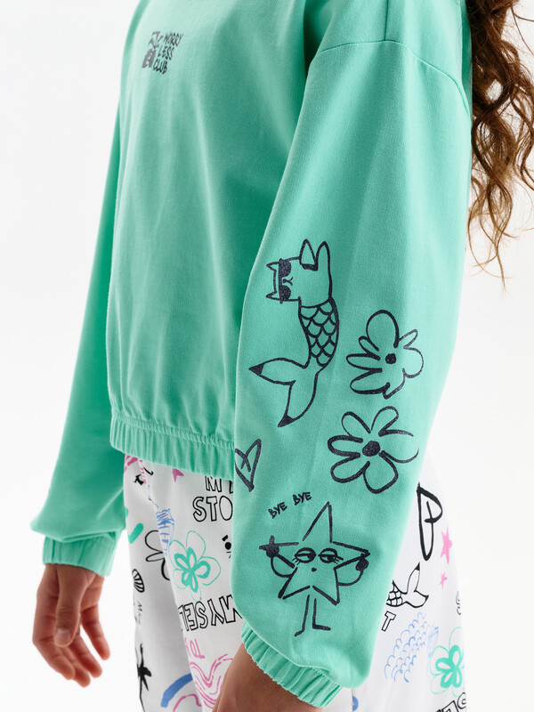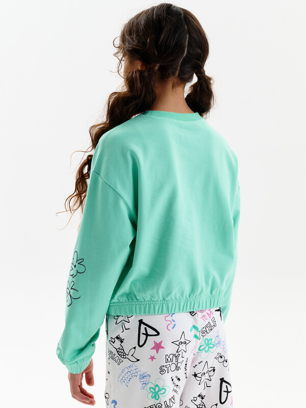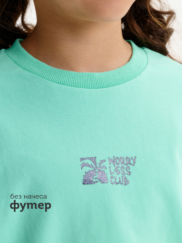 Состав: 100%хлопок Укороченная объемная толстовка из мягкого футера для девочки. Плотность 235 гр/кв.м. 100% хлопок — ткань дышащая, приятная на ощупь и очень комфортная. Низ изделия и рукавов собраны на широкую внутреннюю резинку — модель красиво и аккуратно сидит по фигуре, рукава не сползают. Весь декор с блестками. Перевод на рукавах: Делай то, что чувствуешь. Ты не капля в океане. Ты — весь океан в капле. Перевод спереди: клуб «Беспокойтесь меньше». Комментарии к товару