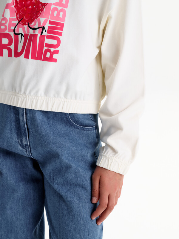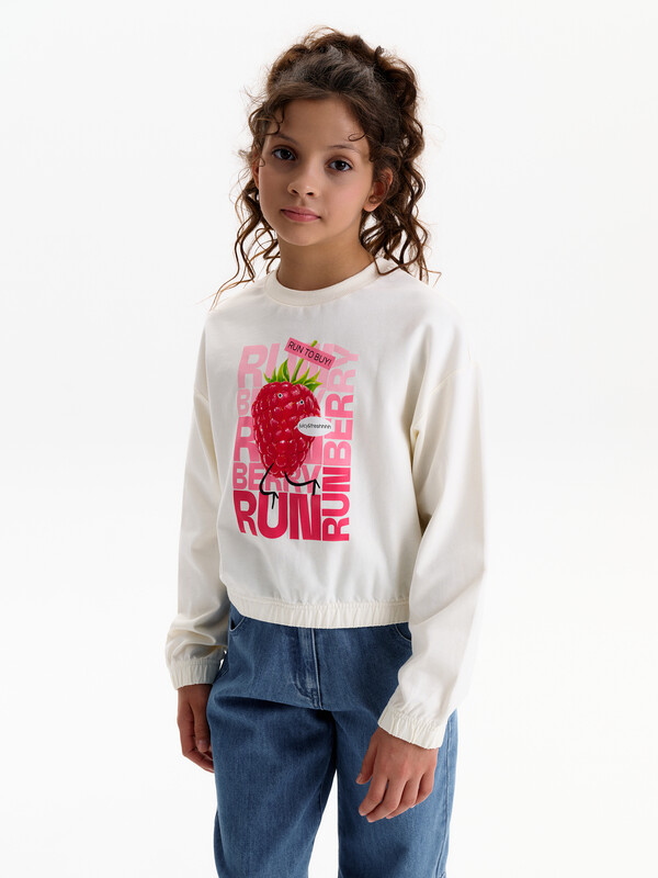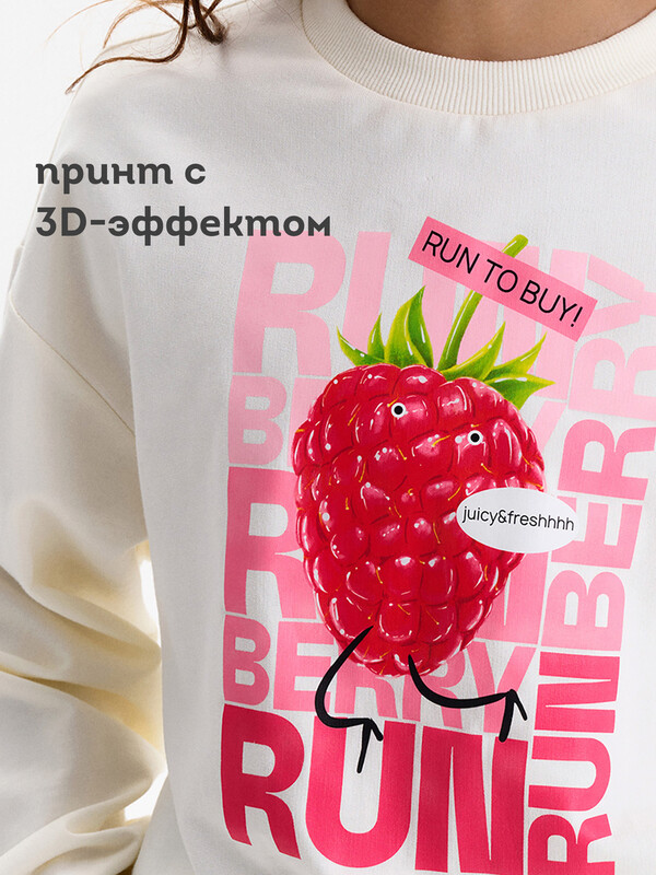 Состав: 100%хлопок Укороченная объемная толстовка из мягкого футера для девочки. Плотность 235 гр/кв.м. 100% хлопок — ткань дышащая, приятная на ощупь и очень комфортная. Низ изделия и рукавов собраны на широкую внутреннюю резинку — модель красиво и аккуратно сидит по фигуре, рукава не сползают. Перевод: двигается реально быстро!! БЕГИ БЕГИ ЯГОДА; сочная и свежая. Комментарии к товару