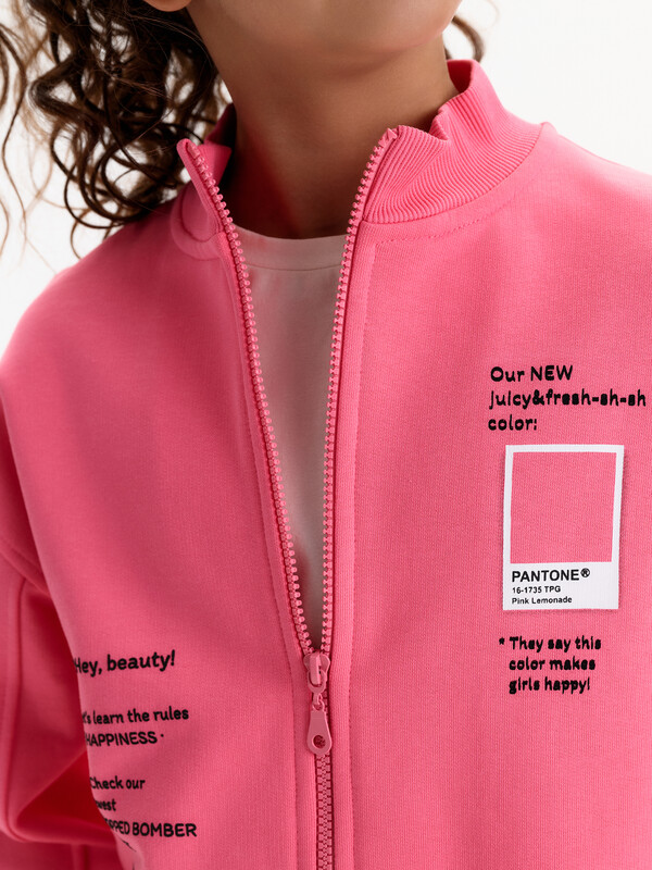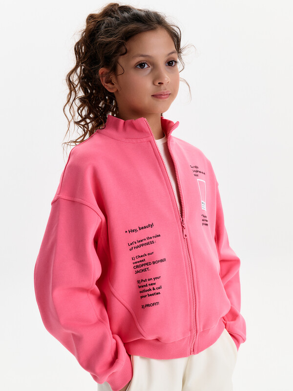 Состав: 100%хлопок Oversize толстовка для девочки средней длины из хлопкового футера, на центральной молнии. Модель увеличенного объёма по линии груди и по низу, со спущенным мягким плечом и аккуратной проймой. Воротник-стойка выполнен из рибаны, низ изделия и рукавов фиксируются плотной рибаной. По переду и рукавам предусмотрены декоративные членения с аккуратной отстрочкой — усиливают визуальный эффект и сохраняют форму. Перевод: Наш новый сочный и свежий цвет розовый лимонад! Говорят, что этот цвет делает девочек счастливыми! Эй, красотка! давай выучим правила СЧАСТЬЯ: 1) зацени наш новый укороченный бомбер 2)надевай свой модный лук и зови с собой подружек! 3)ПРОФИТ! Комментарии к товару