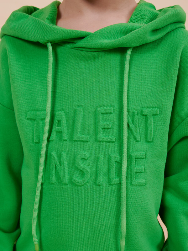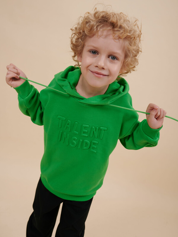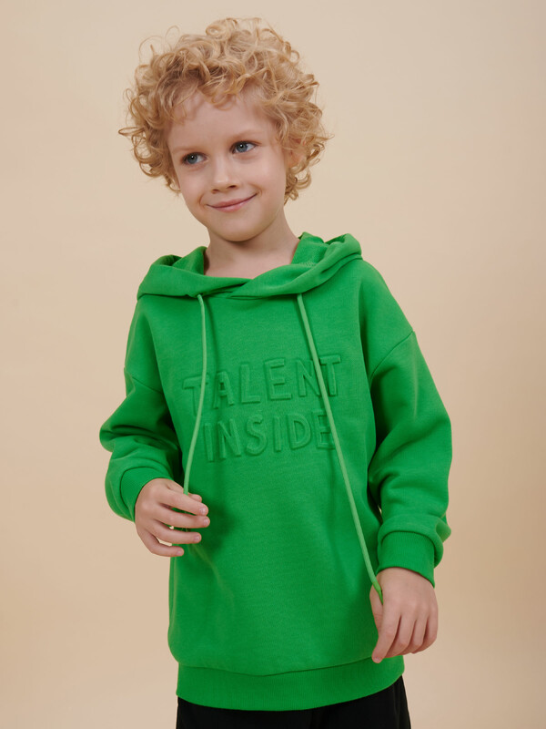 Трикотажная толстовка для мальчика подростка с капюшоном выполнена с высоким содержанием хлопка и добавлением в состав эластана. Приятный к телу материал отлично носится, не дает усадки, не линяет в процессе стирки и сохраняет красивый внешний вид. Хлопок хорошо пропускает воздух, наделяет необходимой гигроскопичностью – ребенок активно двигается, играет, не потеет. Детское худи для мальчика из материала футер-петля. Изделие свободного кроя оверсайз со спущенным плечом, углубленной проймой. Рукава и низ на манжете из риба. Капюшон на запахе, с люверсами и шнурками для регулировки. Изделие выполнено в однотонном цвете на выбор: бежевый, черный, зеленый. Худи для мальчика подростка оверсайз спереди декорировано выпуклым пресс-принтом: "Talent inside" - перевод "Талант внутри". Толстовка оверсайз рассчитана на возраст садика и школы. Понравится как малышам, так и школьникам и подросткам. Размерная линейка: 1 (86); 2 (92); 3 (98); 4 (104); 5 (110); 6 (116); 7 (122); 8 (128); 9 (134); 10 (140); 11 (146). Худи для мальчика - отличный подарок для сына, внука, братика, племянника, крестника! Выбирайте нужный размер по таблице размеров на фото. Цвет товара на экране вашего устройства может отличаться от цвета изделия вживую. Состав: 87%хлопок 13%полиэстер Комментарии к товару