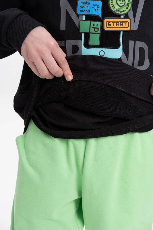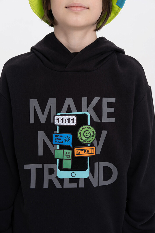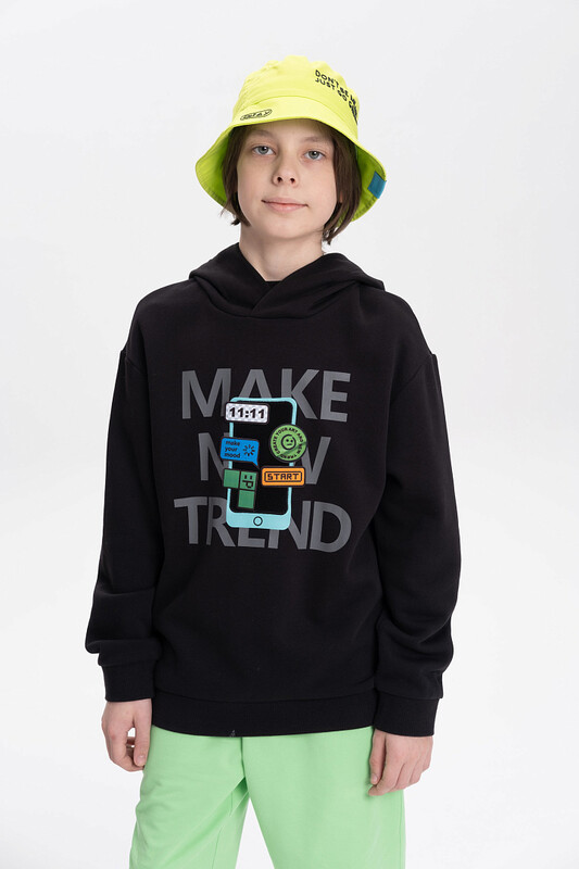 Худи для мальчика без начеса – актуальная вещь в любом сезоне, будь то весна, лето или осень. Кофта спортивная для мальчика выполнена из плотного футера-петля, который отлично согревает в прохладную погоду и при этом хорошо пропускает воздух – ребенок активно двигается, играет, не потеет. Толстовка свободного покроя оверсайз со спущенным плечом, углубленной проймой. Рукава а также низ изделия на манжете из рибаны. Кофта без карманов. Капюшон объемный, двухшовный без регулировки. Изделие выполнено в актуальном стиле Digital и понравится юным геймерам, а также любителям одежды в корейском стиле и в стиле аниме. Пайта в базовом цвете украшено нашивкой-липучкой со съемными стикерами. По переду текстовый принт. Перевод принта "make new trends" - делай новые тренды. Размерный ряд подходит как для малышей так и для подростков.