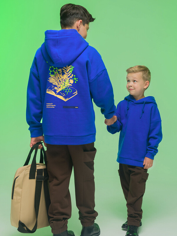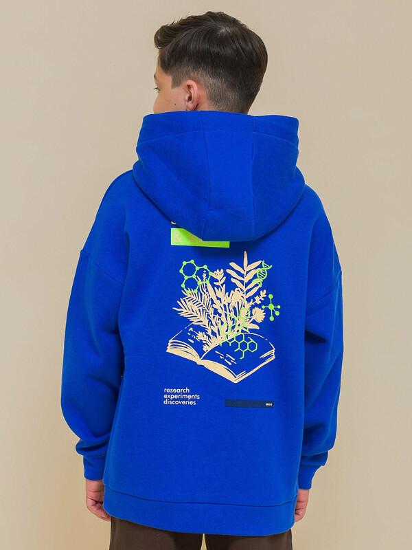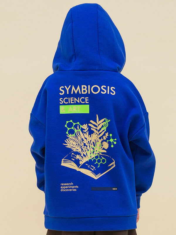 Детское худи с капюшоном для мальчика. Толстовка оверсайз-силуэта со спущенным плечом не будет стеснять движений ребёнка. Объёмное удлинённое худи — один из актуальных модных трендов. Манжеты рукавов выполнены из основного материала, по низу изделия пояс из основной ткани, это немного сдерживает объём, модель смотрится аккуратно. Капюшон с двумя швами, что обеспечивает анатомически правильную форму и комфортную посадку по голове. Капюшон двойной, швы закрыты. Шнуром можно регулировать высоту и объём. За изделием просто ухаживать. Худи с принтом на спине выполнено из ткани с высоким содержанием качественного хлопка (футер с начёсом), что обеспечивает мягкость и воздухопроницаемость. Благодаря полиэстеру толстовка сохраняет цвет и форму в течение долгого времени. Оригинальный принт изображает книгу с растениями и биологическими символами с надписями «симбиоз науки и искусства», «исследования, эксперименты, открытия». Принт эластичный и прочный, без проблем переносит многочисленные стирки. Худи синее, выполнено в модном оттенке «ультрамарин». В линейке представлены следующие размеры: 1 (86); 2 (92); 3 (98); 4 (104); 5 (110); 6 (116); 7 (122); 8 (128); 9 (134); 10 (140); 11 (146). Отличное худи оверсайз для мальчиков и подростков. Худи с начёсом можно носить круглый год: осенью и весной (демисезон), зимой, в прохладную погоду летом. Толстовка подходит для детского сада, прогулок, активного отдыха, а также для дома. Это замечательный подарок сыну, брату, внуку или племяннику на любой праздник.