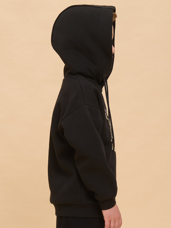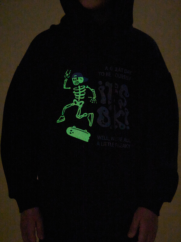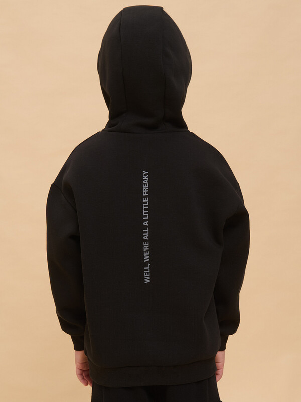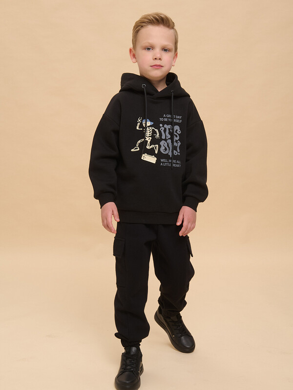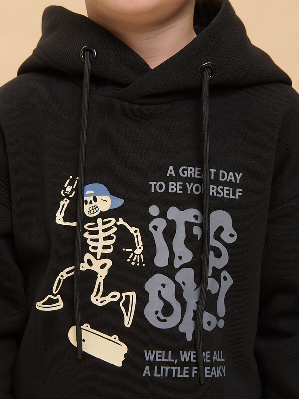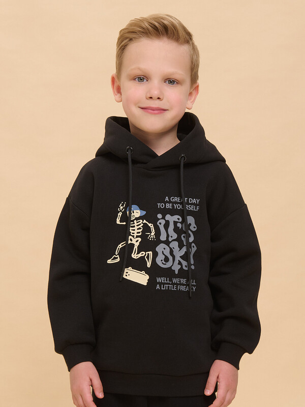 Толстовка детская из футера с начёсом для мальчика. Худи трендового оверсайз-силуэта со спущенным плечом подарит ребёнку комфорт и не будет стеснять его движений. Толстовка с капюшоном защитит от холода и ветра. Модель дополнена манжетами из эластичной рибаны по низу и рукавам. Рибана не растягивается и надолго сохраняет отличный внешний вид. Изделие неприхотливо в уходе. Толстовка на мальчика выполнена из ткани с высоким содержанием хлопка — модель приятная на ощупь, дышащая и гипоаллергенная. Благодаря полиэстеру худи износостойкое, сохраняет форму даже после множества стирок. Изделие выполнено в универсальной расцветке, легко комбинируется с любыми брюками, джинсами. Толстовка декорирована принтом в актуальном готическом стиле, надписи переводятся: «хороший день, чтобы быть собой», «все окей!», «все мы немного странные». Принты эластичные и устойчивые, не боятся частых стирок. Фишка модели — принты светятся в темноте! Это не оставит равнодушным ни одного ребёнка! Отличное худи оверсайз для мальчиков дошкольного и младшего школьного возраста, а также подростков. Джемпер подходит для детского сада, прогулок, отдыха, дома. Худи с капюшоном для мальчика подходят для круглогодичной носки. Помните о правильном уходе за изделием: рекомендуется стирать при температуре не выше 30 °C, без предварительного замачивания, с изнанки. Это поможет сохранить качество и цвет толстовки на длительное время.