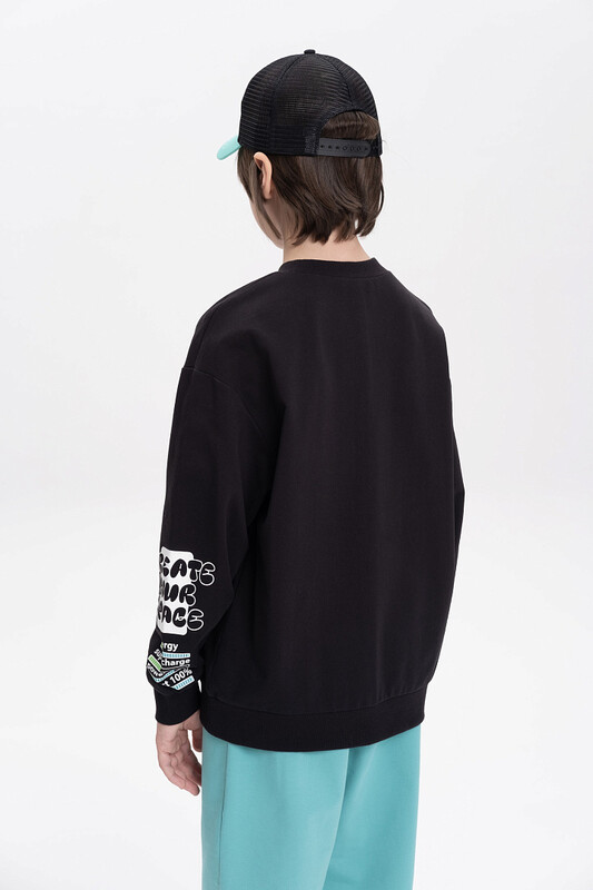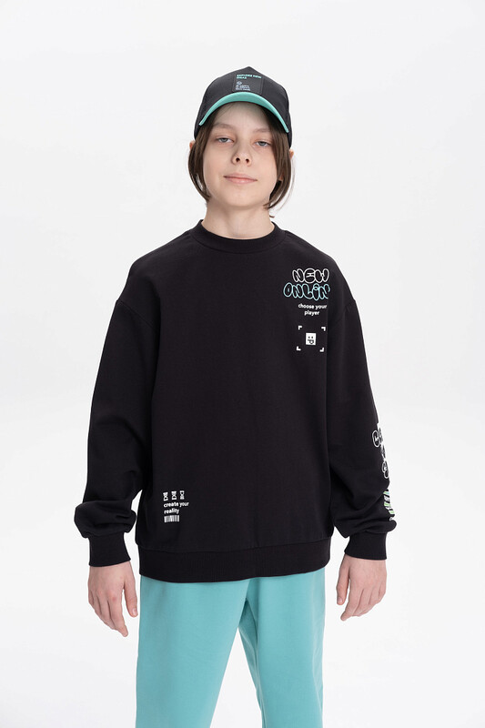 Свитшот без начеса из материала футер-петля. Манжеты и низ изделия из рибаны. По переду принт в виде смайлика, а также текстовый принт. Перевод надписи: "new online" - новый онлайн, "choose your player" - выбери своего игрока, "create your reality" - создай свою реальность. Рукав также украшен принтом с надписью. Перевод надписи "create your space" - создавай свое пространство, "energy, power-ups, coolest-100%" - энергия, бонусы, крутость - 100%. В составе ткани преобладает высококачественый хлопок — спортивная кофта приятна на ощупь и прекрасно пропускает воздух. Тонкую весеннюю кофту можно носить круглый год. Подходит для любителей корейской и японской моды, стиля аниме. Широкая размерная сетка подойдет как для малыша так и для подростка.