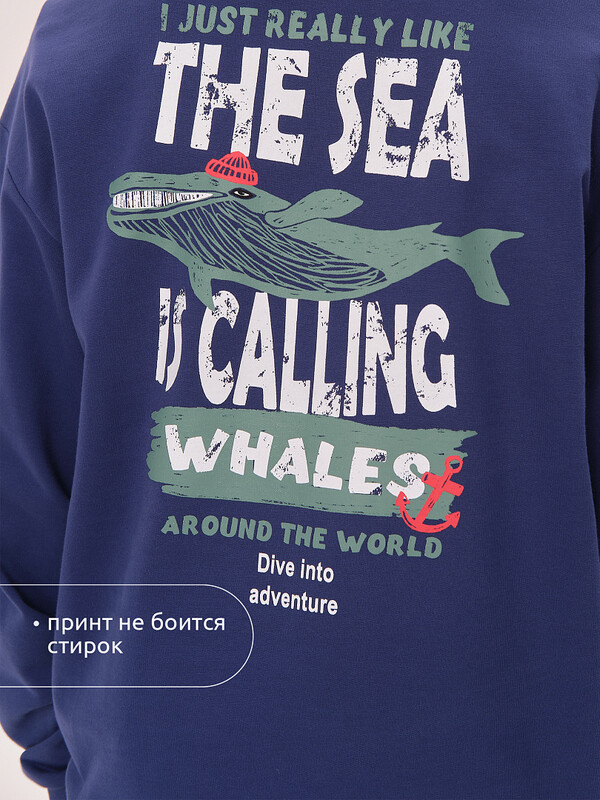 Состав: 100%хлопок Свитшот без начеса из материала футер-петля. Манжеты и низ изделия из рибаны. Толстовка весенняя украшена принтом в морском стиле с надписями. Перевод надписей "I just really like the sea is calling" - мне просто очень нравится что море зовёт, "whales around the world" - киты по всему миру, "dive into adventure" - погрузись в приключение. В составе ткани преобладает высококачественый хлопок — спортивная кофта приятна на ощупь и прекрасно пропускает воздух. Тонкую кофту можно носить круглый год. Широкая размерная сетка подойдет как для малыша так и для подростка. Комментарии к товару