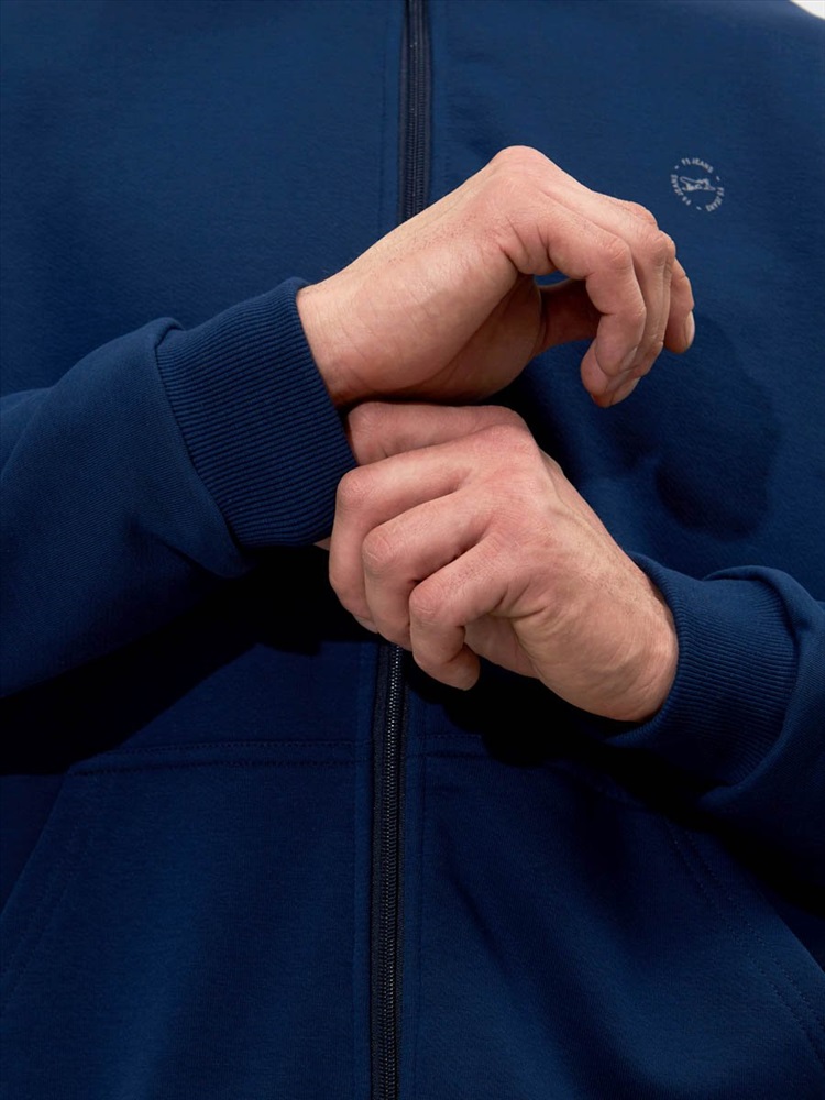 Классическая толстовка на молнии, выполнена из хлопкового полотна с добавлением полиэстера. Мягкая и приятная на ощупь, обладает хорошей гигроскопичностью, позволяет коже дышать. Модель c длинными рукавами. Манжеты рукавов и низ толстовки оснащены эластичными резинками. Спереди толстовка дополнена карманом "кенгуру".
