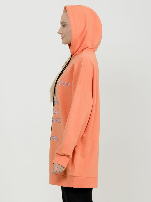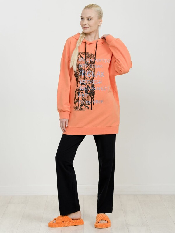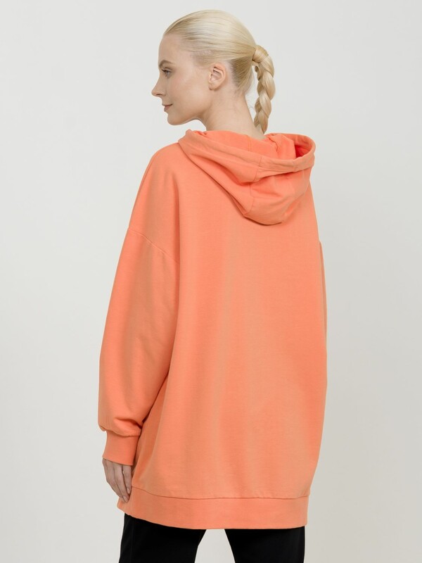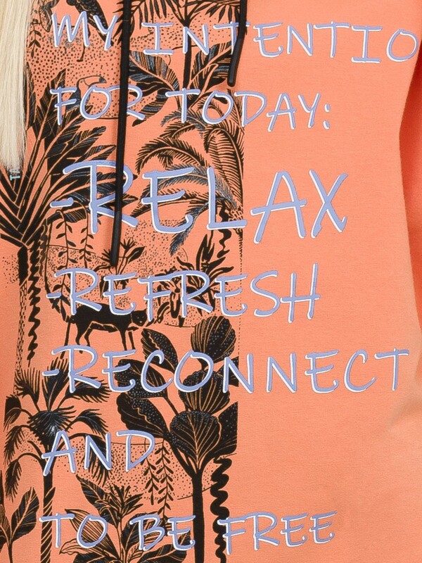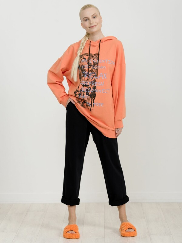 Удлиненное худи мангового цвета большого объема с эластичным принтом с глянцем. Манжеты по низу рукава и низу изделия из рибаны. Объем капюшона регулируется шнурком черного цвета. Перевод Мои намерения на сегодня расслабиться, освежиться, перезагрузиться и быть свободной.
