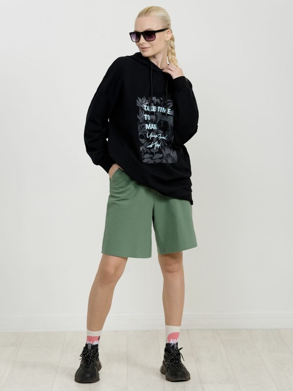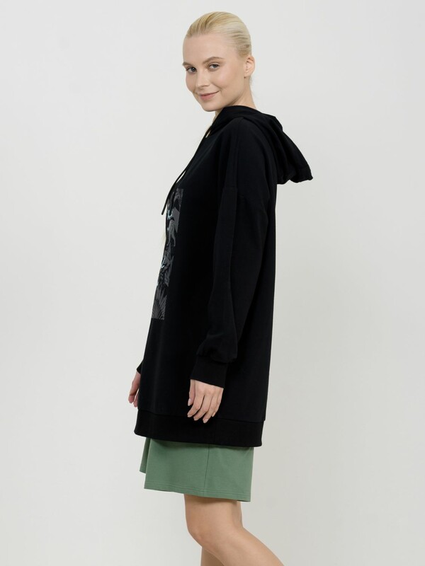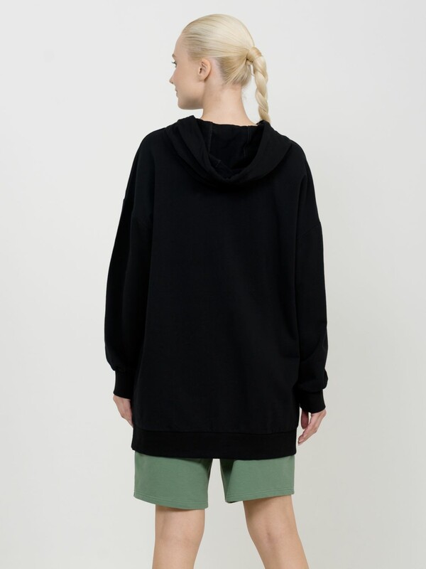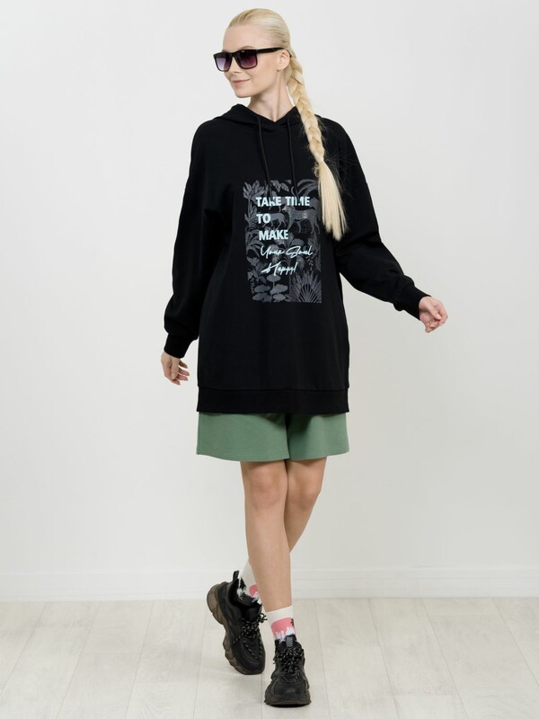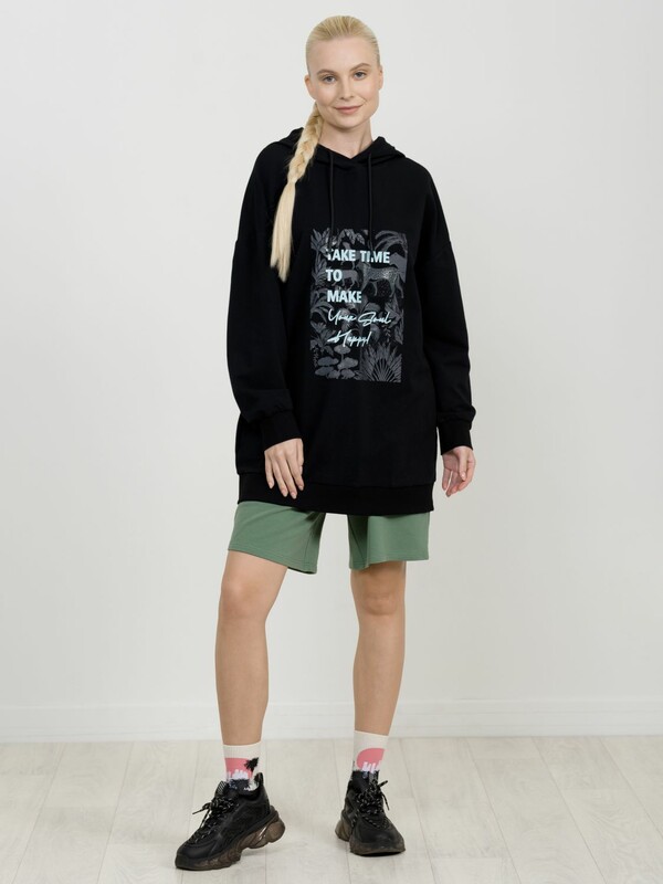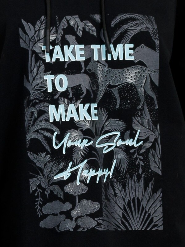 Удлиненное худи большого объема с эластичным принтом с глянцем. Манжеты по низу рукава и низу изделия из рибаны. Объем капюшона регулируется шнурком черного цвета. Перевод Найдите время, чтобы сделать свою душу счастливой.