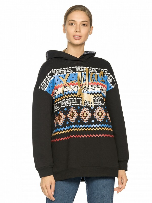 Состав: 60%хлопок 40%полиэстер, вставка: 60%полиэстер 40%хлопок Утеплённое худи, уютный увеличенный объём. Футер с начесом. Капюшон с декоративной тесьмой с вытканным рисунком и настроченной внутри, перевод Рождество. Линия плеча спущена, манжеты по низу рукавов и изделия из рибаны. Небольшой перепад длин между передом и спинкой. Стойкий и эластичный rubber принт с золотым металликом, перевод Волшебное Рождество. Комментарии к товару