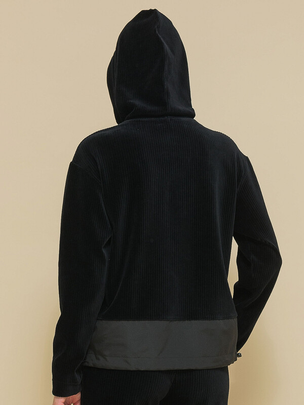 Женская плюшевая толстовка со вставкой из гладкой курточной ткани. Сочетание материалов с разной фактурой — актуальный тренд сезона. Свободная толстовка из трикотажного вельвета со спущенным плечом подарит вам ощущение комфорта и уюта. Худи с капюшоном на кулиске,  защитит от холода и ветра. По низу изделия также есть кулиска — её можно затянуть и получится кроп-толстовка. Худи однотонное, без принта. Неприхотливо в уходе. В составе ткани преобладает высококачественый хлопок — толстовка мягкая и прекрасно пропускает воздух. Полиэстер и эластан обеспечивают формоустойчивость надолго. Модель представлена в двух цветах. Чёрная толстовка — практичный, базовый вариант. Серое худи также универсально. Размерный ряд: XS (42); S (44); M (46); L (48); XL (50). Толстовка подходит женщинам, девушкам, девочкам-подросткам. Она идеальная для работы, учёбы, отдыха, перелётов, прогулок. А также может быть использована в качестве домашней одежды. Худи можно носить осенью и весной (демисезон), зимой и в прохладную погоду летом. Такую толстовку легко комбинировать с разными моделями брюк. Она станет замечательным подарком сестре, подруге или маме на Новый год или любой другой праздник.