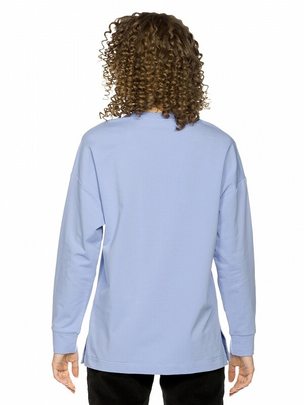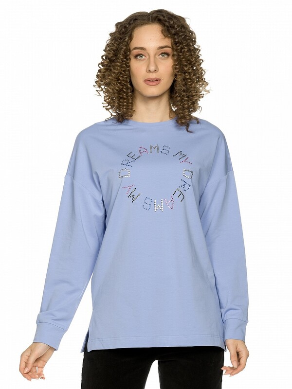 Толстовка женская. Новинка. Свитшот из пластичного футера актуального силуэта и объема. Сильно спущенная линия плеча, аккуратная небольшая горловина. Разрезы в боковых швах 11 см. Манжеты из основной ткани. Декор из разноцветных страз и серебристого металлика. Перевод Мои мечты .
