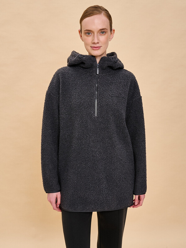 Худи женское – удобная и практичная одежда из новой коллекции бренда Pelican. Пушистая толстовка с капюшоном, кулиской и молнией по горловине до середины груди универсальна. Ее можно надеть под верхнюю одежду, она не будет стеснять движений. Легко комбинировать с другими моделями из зимней коллекции. Шнурки с карабинами - для фиксации нужной длины. Изделие с карманами. Худи с капюшоном отлично будет сочетаться как с футболкой, так и джемпером с воротником-стойкой из коллекции. Толстовка женская на молнии с капюшоном не требует особого ухода. Материал изделия (бербер-флис) после стирки не растягивается, не линяет. Быстро сохнет, что очень удобно в поездках за город на каникулы с детьми и семьей. На рукавах и по низу худи – оригинальный кант из ткани в тон основного материала. Эта кофта с замком по горловине точно станет любимой вещью вашего гардероба. Толстовка женская будет защищать от ветра и непогоды и отлично сочетается с брюками, треггинсами из теплой ткани, курткой или пальто. Новые модели выполнены в приятной палитре - сине-серого цвета (полуночный синий) и молочного. Модная флисовая кофта женская точно понравится любой девушке, девочке-подростку и женщине. Худи оверсайз не сковывает движений при занятиях зимним спортом. Такую вещь также можно подарить на Новый год или Рождество в качестве заботливого подарка, устроить фотосессию в стиле сканди. Только представьте, как уютно можно укутаться в теплый и мягкий флис зимним вечером или утеплиться на снежную прогулку с семьей.