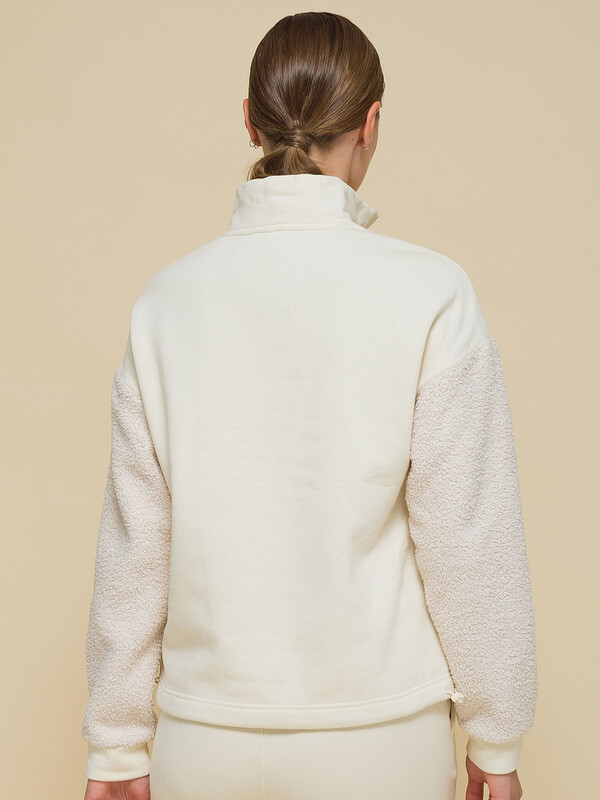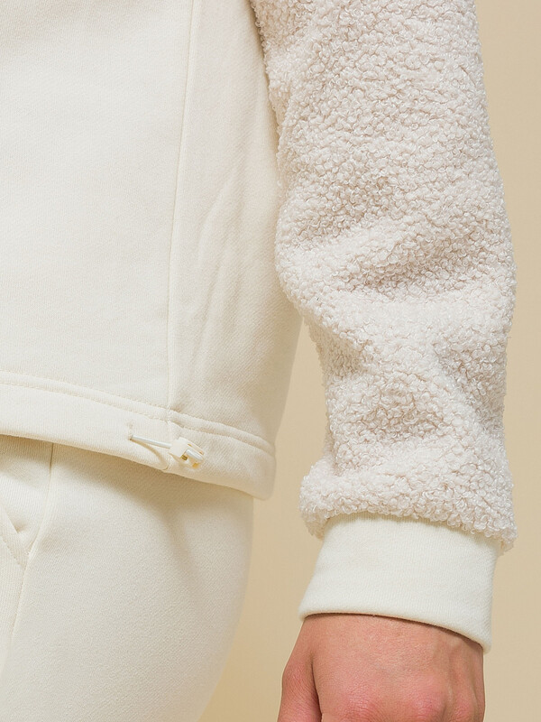 Стильный женский свитшот свободного силуэта со спущенным плечом. Толстовка без капюшона выполнена в комбинации двух материалов: гладкого футера и фактурного меха «барашек». Это актуальный модный тренд. Толстовка с воротником-стойкой. Он защитит от холода и ветра. Застёжка на короткую молнию — удобно и быстро застёгивать и расстёгивать. По низу удобная кулиска — можно регулировать объём и посадку. Свитшот однотонный, без принта. Изделие неприхотливо в уходе, его легко стирать, ткань быстро сохнет и не склонна к образованию катышков. В составе основной ткани (футкер с начесом) преобладает качественый хлопок — толстовка мягкая, отлично дышит. Рукава выполнены из мягкого и приятного на ощупь бербер-флиса (фактура «барашка»). Свитшот представлен в двух универсальных цветах: чёрном и молочном. Его легко сочетать с различными моделями брюк. Размерная линейка: XS (42); S (44); M (46); L (48). Толстовка идеальна как для женщин, так и для девушек и девочек-подростков. Подходит и высоким, и невысоким девушкам. Оверсайз-свитшот — прекрасный выбор для повседневной носки и активного отдыха. Он тёплый, лёгкий и мягкий. Для круглогодичного применения: прохладным летом, осенью, зимой, весной и демисезон. Это модный и практичный подарок для сестры, подруги или дочки на любой праздник.