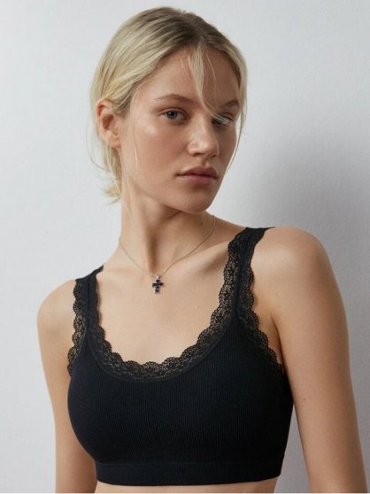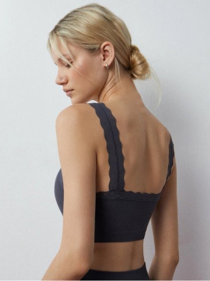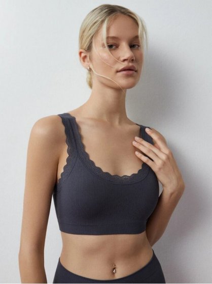 Производитель: Minimi Оптовая продажа. Топ женский из мягкой микрофибры с текстурой "рубчик", на широких не регулируемых кружевных бретелях, бесшовный, однотонный. Состав: Полиамид: 91% Эластан: 9%