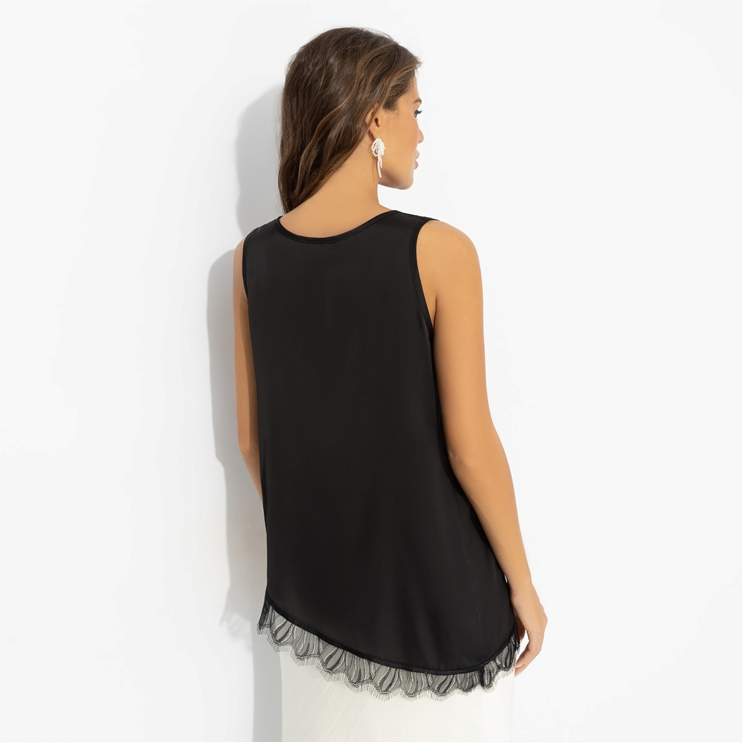 Один взгляд – и уже ясно, что за этой девушкой невозможно угнаться. Чёрный топ из струящегося шелка скользит по фигуре, оставляя лишь тонкий намёк. Она играет в свою игру: вы видите её отражение в витрине, а в следующий миг она уже исчезает за поворотом. Удлинённый топ без рукавов с мягким круглым вырезом и тонкой кружевной французской отделкой по низу создаёт эффект второй кожи и подчёркивает хрупкость плеч. Надевай, когда хочется добавить в образ немного кинематографичности и ощущения неуловимой роскоши.