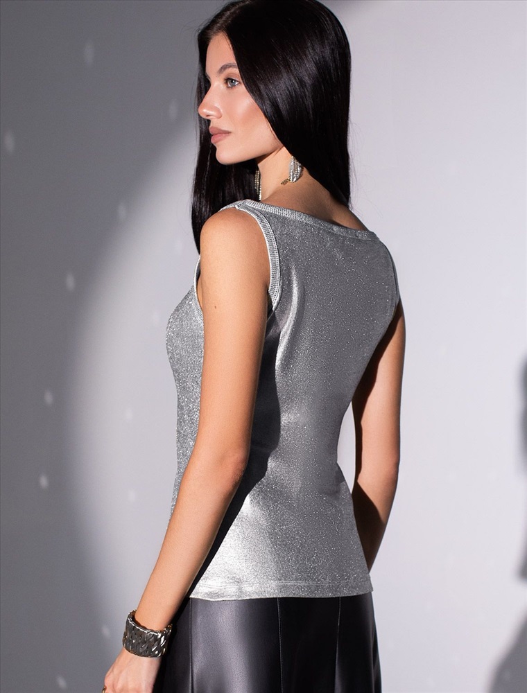 Эффектный топ серебристого цвета с широкими лямками — идеальный выбор для создания стильного образа на каждый день или вечерний выход. Ткань в мелкий рубчик визуально вытягивает силуэт, правильный крой подходит на любую фигуру, комфортно садится на большие размеры, не сковывая движений. Изысканный матовый блеск металлик добавляет современный акцент даже самому простому образу.