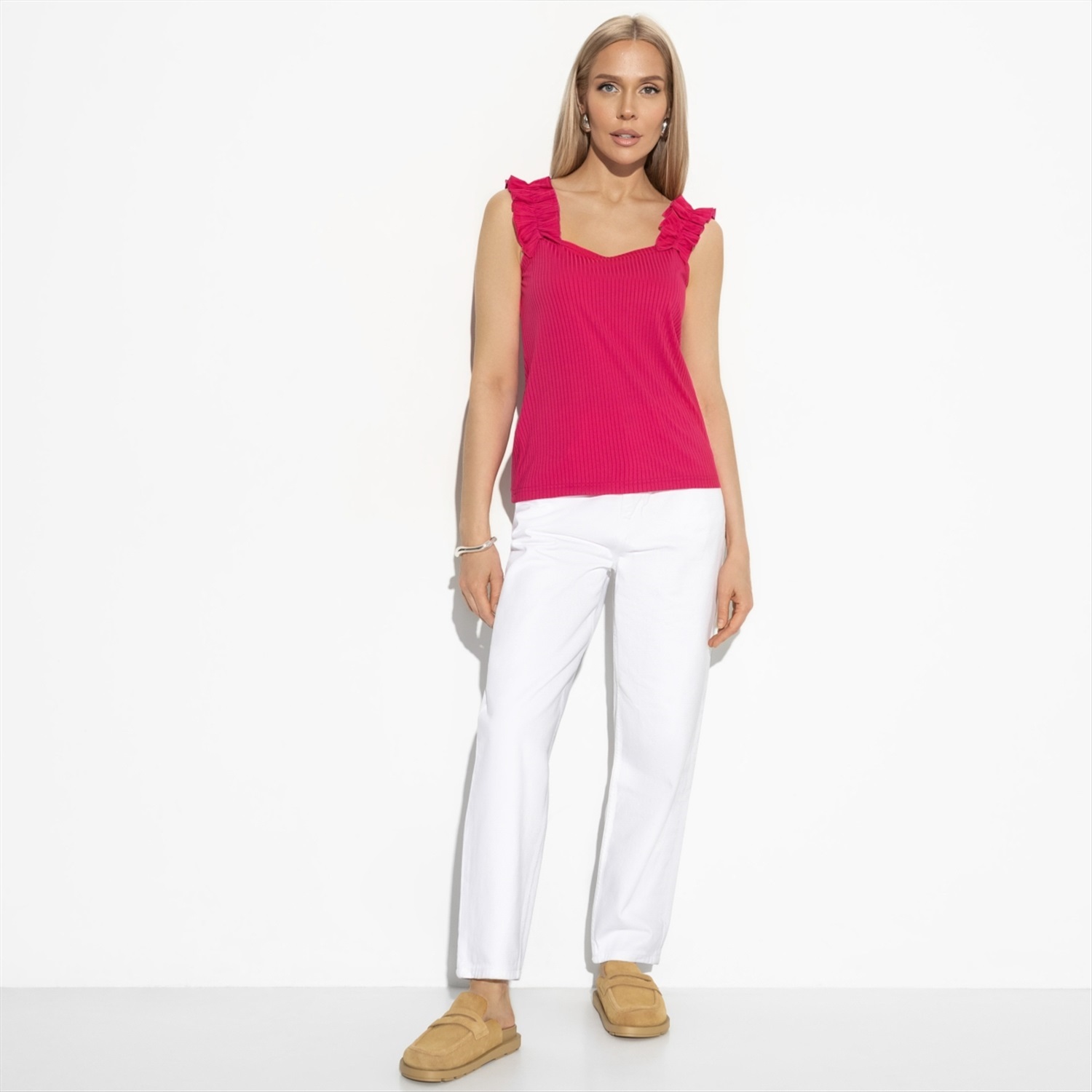 ТН ВЭД: 6106200000; Состав: Трикотаж «лапша» (60% п/э, 30% вискоза, 5% спандекс, 5% нейлон); Плотность ткани: Средняя; Тип ткани: Трикотаж; Вид застежки: Нет; Карманы: Нет; Основной цвет ткани: Фуксия; Отрезная талия: Нет; Подклад: Нет; Резинка по талии: Нет; Рисунок/раппорт: Нет, все изделия идентичны; Сезон: Лето