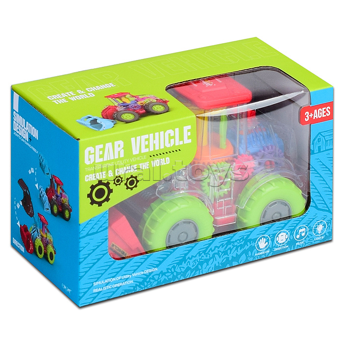 Движется в случайном направлении. Разноцветная подсветка, вращающиеся шестеренки, нейтральная мелодия без слов. Работает от 3-х батареек «ААА» (не входят в комплект). Размеры: 20 х 9,5 х 11 см. Материал: пластик. Для детей от 3-х лет. Соответствует требованиям безопасности продукции.