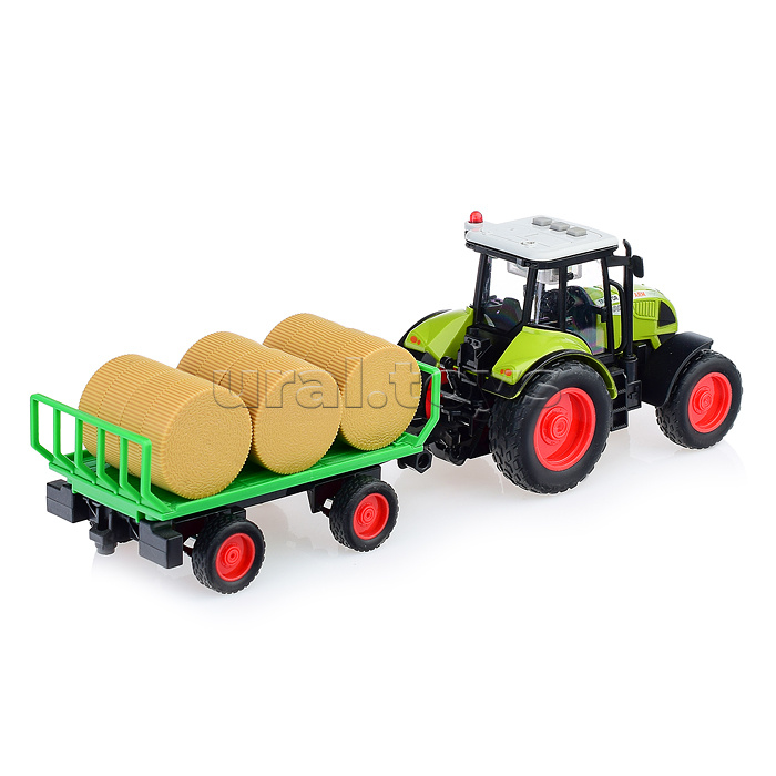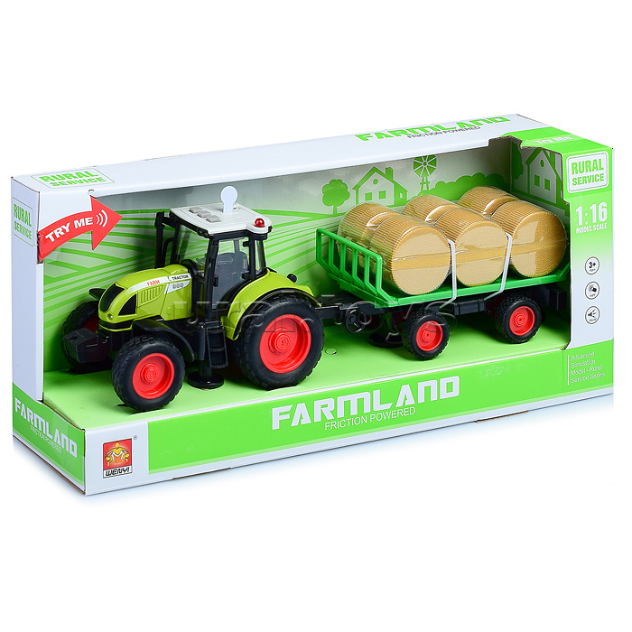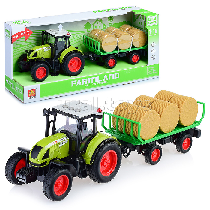 Наличие: >10 В наборе: трактор, прицеп, 6 тюков с сеном. • Трактор: - Размер: 17×11×9 см. - инерционный механизм. - световые и звуковые эффекты. - прицепное устройство. - работает от 3 батареек AG13, входят в комплект для демонстрации. • Прицеп: - Размер: 20×8×8 см. - можно отцепить от трактора. • Тюки с сеном: - Размер: 5х5х3 см. • Материалы: полимерные материалы, пластик. • Соответствует требованиям безопасности продукции. • Для детей от 3-х лет. Комментарии к товару