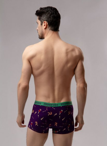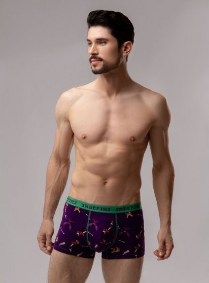 Оптовая продажа. Трусы боксеры мужские фиолетового цвета с ярким принтом, из натурального хлопка с добавлением эластана, повышающий прочность и качество одежды, создавая идеальное облегание фигуры. Имеют среднюю посадку, мягкую и эластичную открытую резинку по талии с фирменным логотипом, профилированный гульфик. Модель полностью закрывает ягодицы и немного опускается на бедра, не ограничивает движения и обеспечивает комфорт в течении всего дня. Подходят как для ежедневного ношения, так и для занятий спортом.
