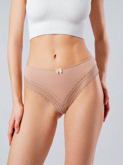 Оптовая продажа. Трусики слипы женские из натурального хлопка с добавлением эластана, повышающий прочность и качество одежды, создавая идеальное облегание фигуры. Имеют среднюю посадку, мягкую и эластичную резинку по талии, удерживающие трусы во время носки. Модель выполнена в бежевом цвете. Кружево по краям придаёт изделию женственность и элегантность. Гигиеничная хлопковая ластовица позволяет избежать трения и раздражения кожи. Удобная и комфортная модель для повседневного белья. Рекомендуется бережная стирка при 30С.
