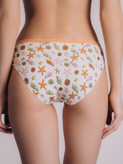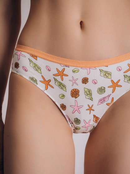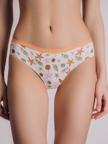 Оптовая продажа. Трусики слипы женские из натурального хлопка с добавлением эластана, повышающий прочность и качество одежды, создавая идеальное облегание фигуры. Имеют среднюю посадку, мягкую и эластичную резинку по талии, удерживающие трусы во время носки. Модель выполнена в белом цвете с рисунком в виде морских ракушек. Гигиеничная хлопковая ластовица позволяет избежать трения и раздражения кожи. Удобная и комфортная модель для повседневного белья. Рекомендуется бережная стирка при 30С.