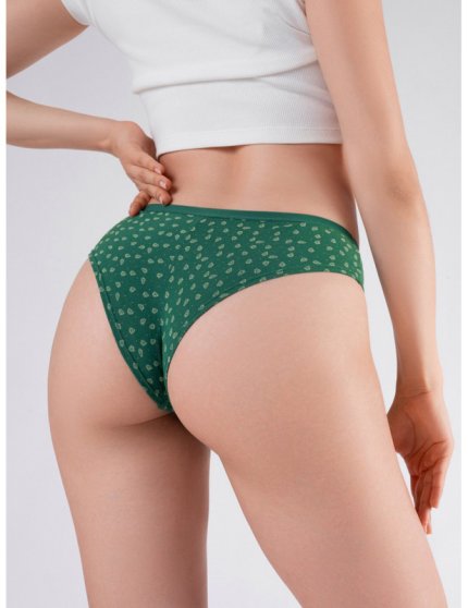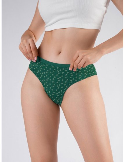 Оптовая продажа. Трусики танга женские зеленого цвета с рисунком елочек, из натурального хлопка с добавлением эластана, повышающий прочность и качество одежды, создавая идеальное облегание фигуры. Имеют среднюю посадку, мягкую и эластичную резинку по талии, удерживающие трусы во время носки. Гигиеничная хлопковая ластовица позволяет избежать трения и раздражения кожи. Удобная и комфортная модель для повседневного белья. Рекомендуется бережная стирка при 30С.