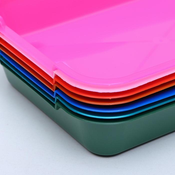 Габариты: 36 x 26 x 6,5; Страна: Россия; В боксе: 60 шт; Состав: Пластик; Материалы: пластик; Фасовка: по 1 шт; Индивидуальная упаковка: Без упаковки; Сертификат: Не подлежит сертификации; Цвет: МИКС; Форма: Прямоугольная; Длина, см: 36; Ширина, см: 26; Высота, см: 6,5; Вид туалета: Лоток