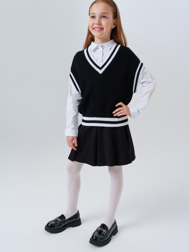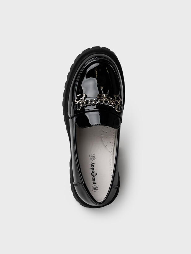 Совет по стилю: сочетайте лаковые нарядные лоферы для подростков с юбками, сарафанами, брюками и блузками из школьной коллекции PlayToday. Особенно гармонично они смотрятся с элементами сдержанного дизайна — так декоративная цепочка станет главным акцентом в образе.