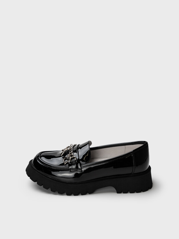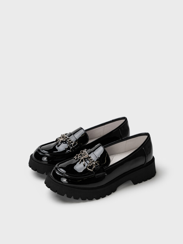 Эти стильные подростковые туфли для девочек выполнены в форме лоферов — классическая модель с закрытым верхом и декоративной цепочкой превращает обычную сменку в модный элемент образа. Лаковая поверхность смотрится аккуратно и элегантно, а яркие навесы на цепочке добавляют игривый акцент, который обязательно понравится школьницам.